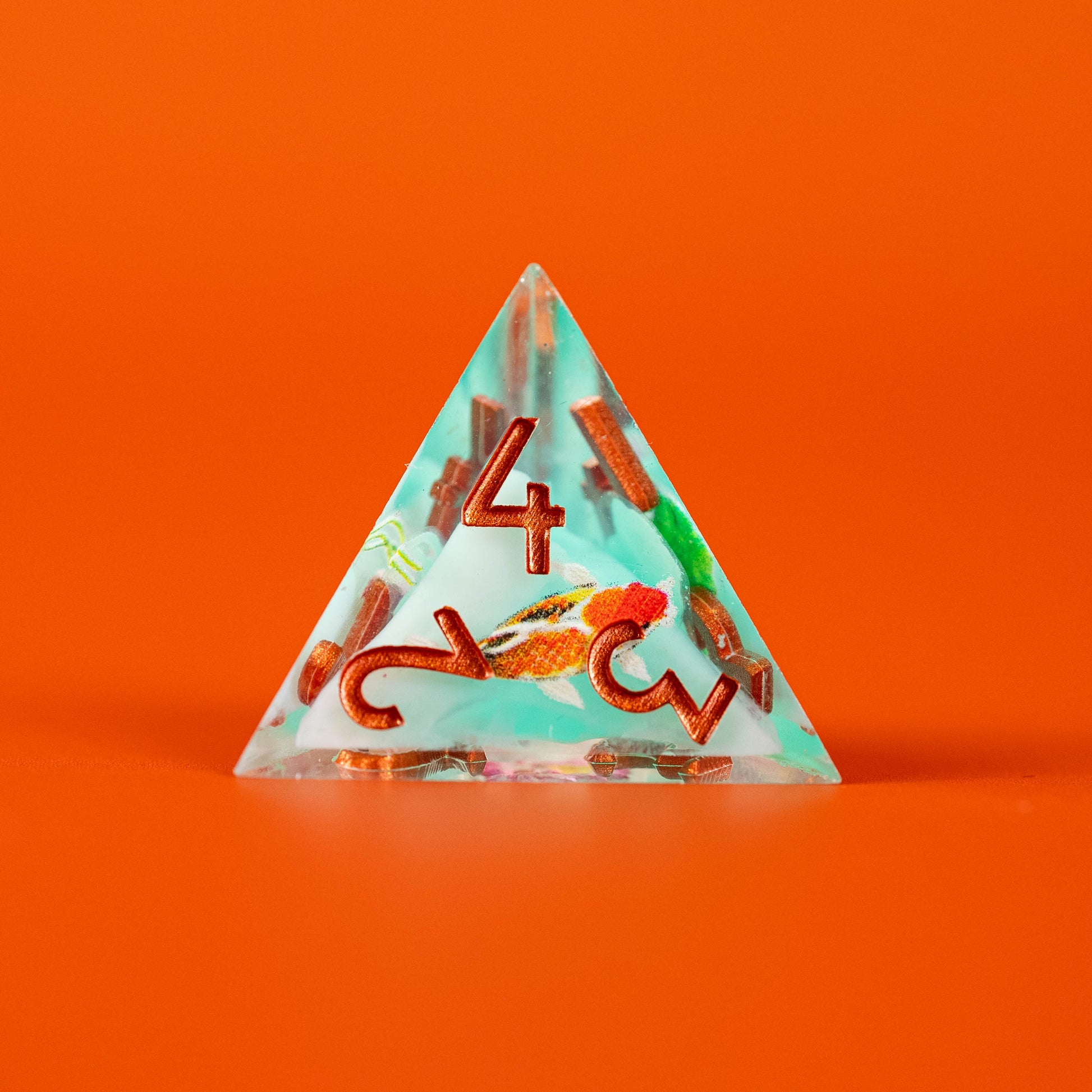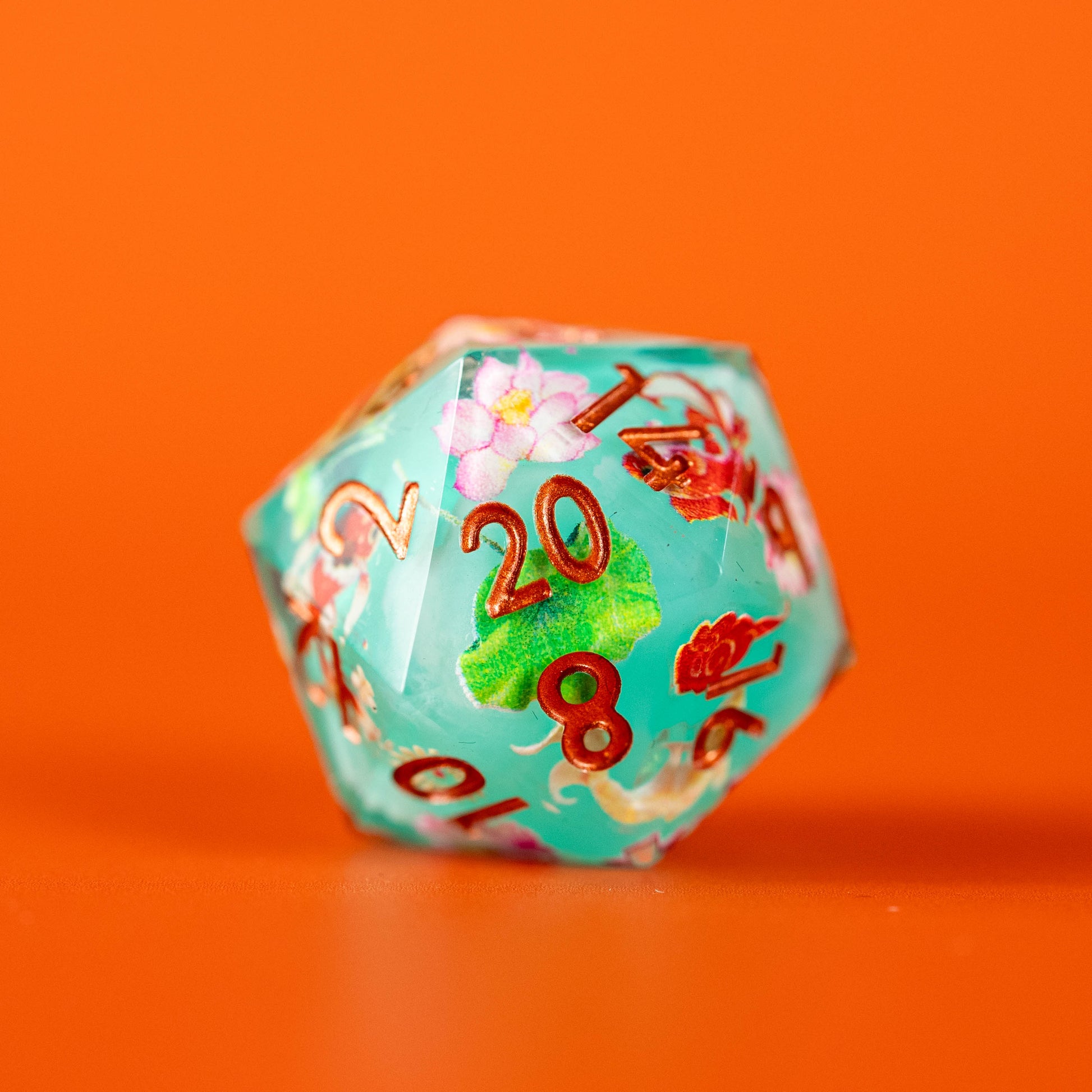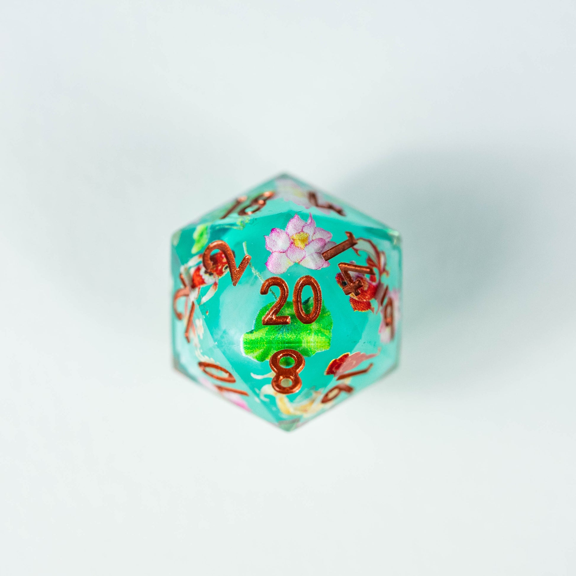 Offrez-vous un moment de calme au cœur d’un bassin japonais avec le set de dés "Eau Paisible". Teintés d’un bleu clair cristallin, ces dés évoquent la tranquillité d’un étang où les poissons koi glissent élégamment parmi des nénuphars et des reflets scintillants. Chaque jet de dés devient une invitation à la sérénité et à l’émerveillement.