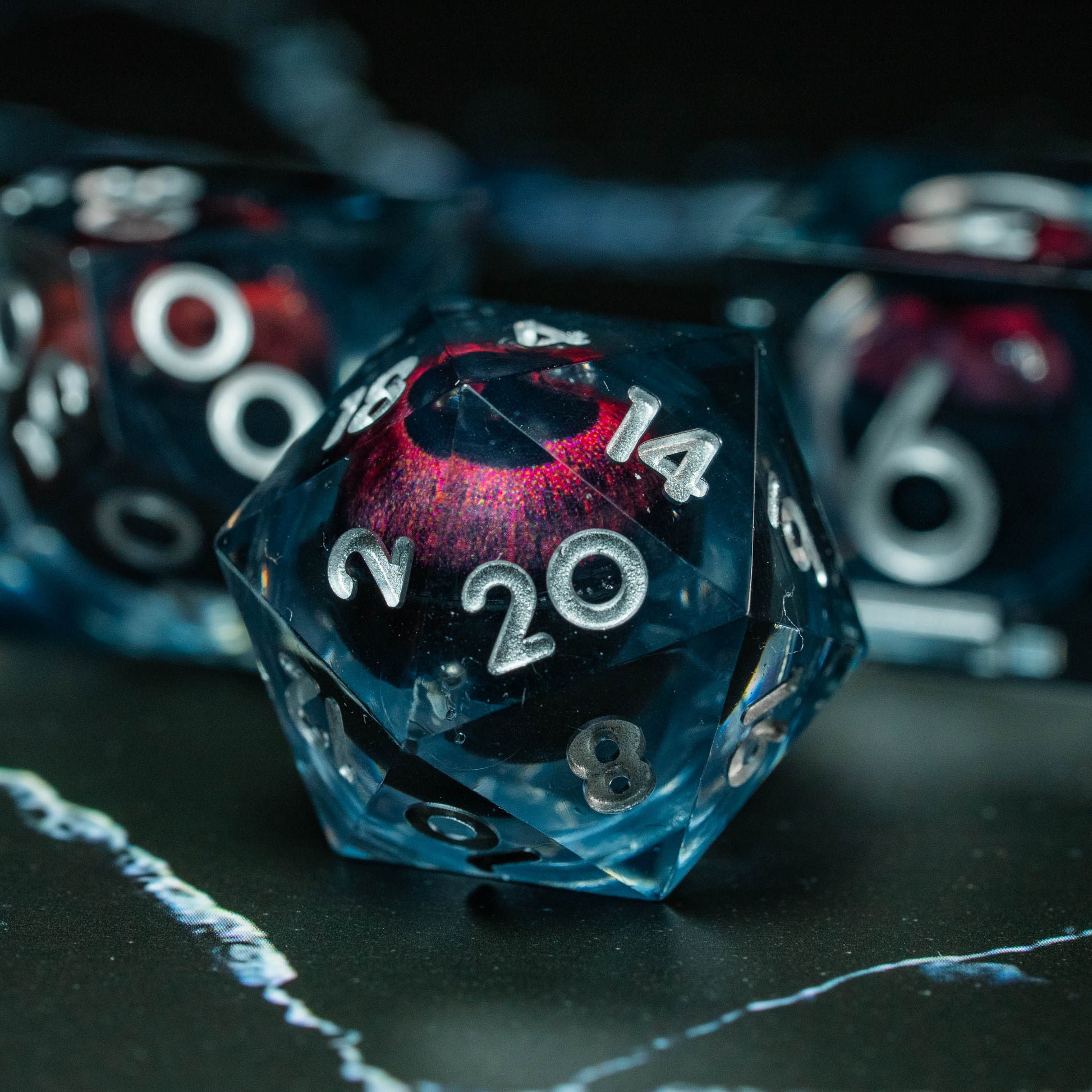 Œil Démoniaque est un set de dés JDR à cœur liquide (liquid core) contenant un œil solide.