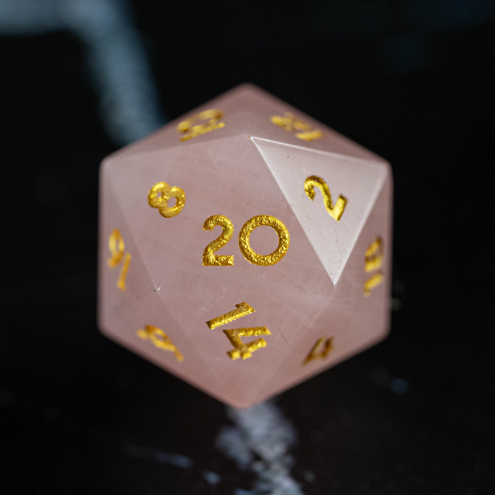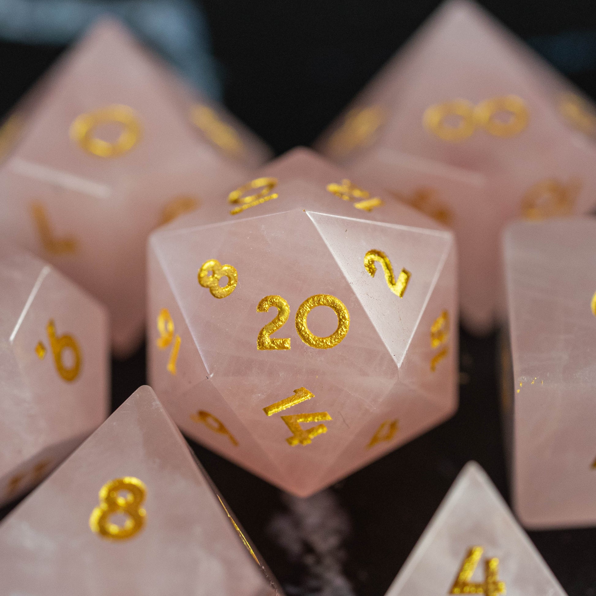 Das Rosenquarz RPG Würfelset ist farbig und Legenden Golden. Es besteht aus 7 polyedrischen Würfeln, die für Pen-&-Paper-Rollenspiele hergestellt wurden. Die Würfel in diesem Set sind etwas größer als die Standardgröße.