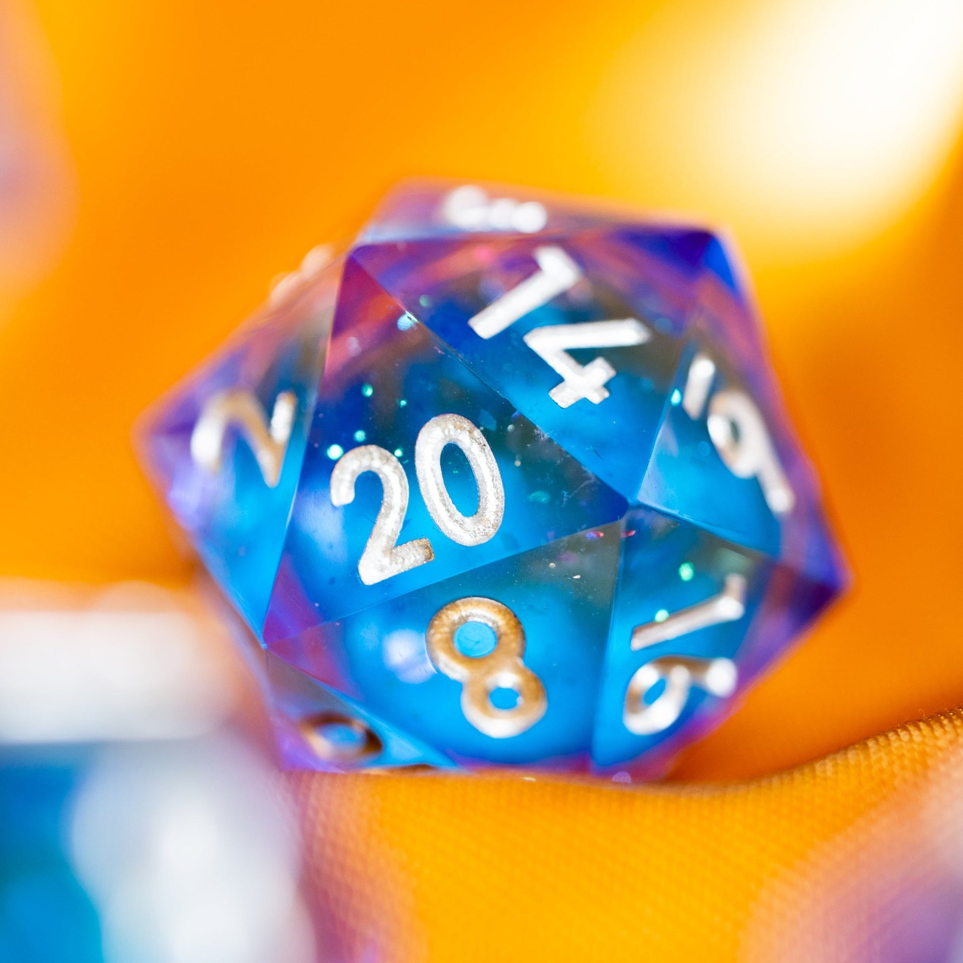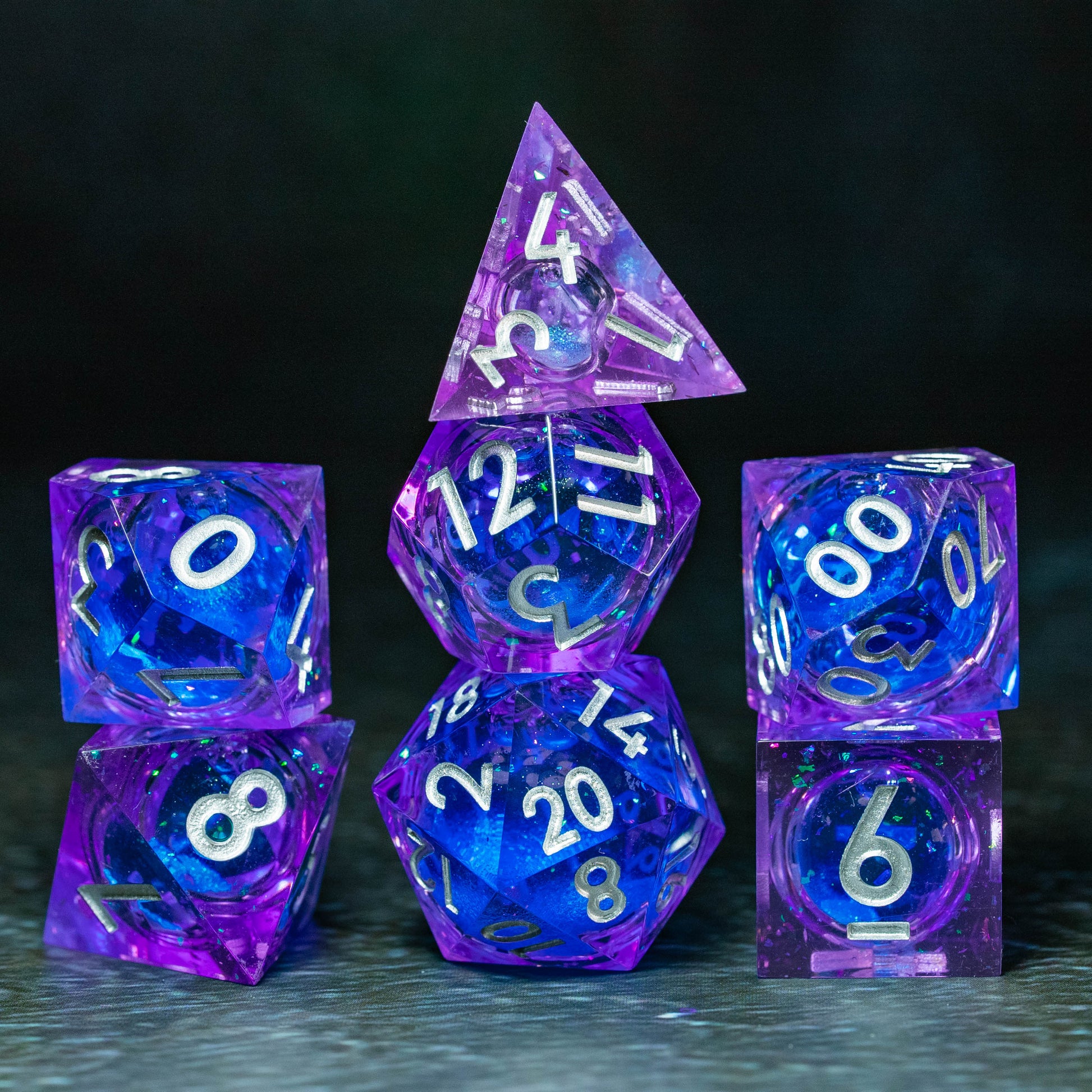 Übernehmen Sie die Verantwortung Nutze die Macht des Arkanen und beobachte, wie sie mit jedem Wurf auf deine Feinde entfesselt wird. Diese transparenten violetten Würfel enthalten einen blau schimmernden flüssigen Kern, gefüllt mit silbernem Glitzer, der sich bei jedem Gebrauch mit mystischer Eleganz entfaltet. Lassen Sie den Funken der Magie Ihre Rollenspielabenteuer zu verzauberten Horizonten führen.