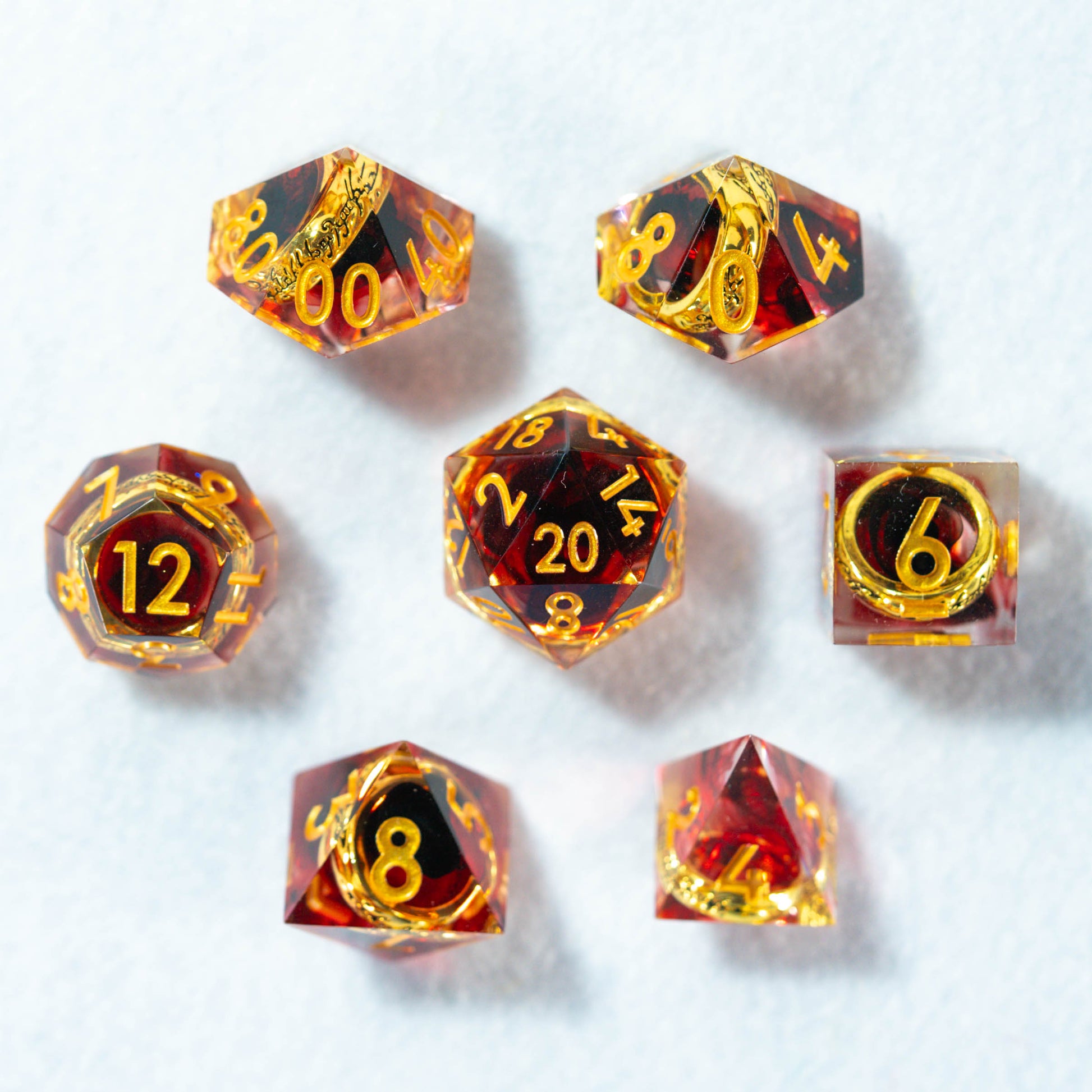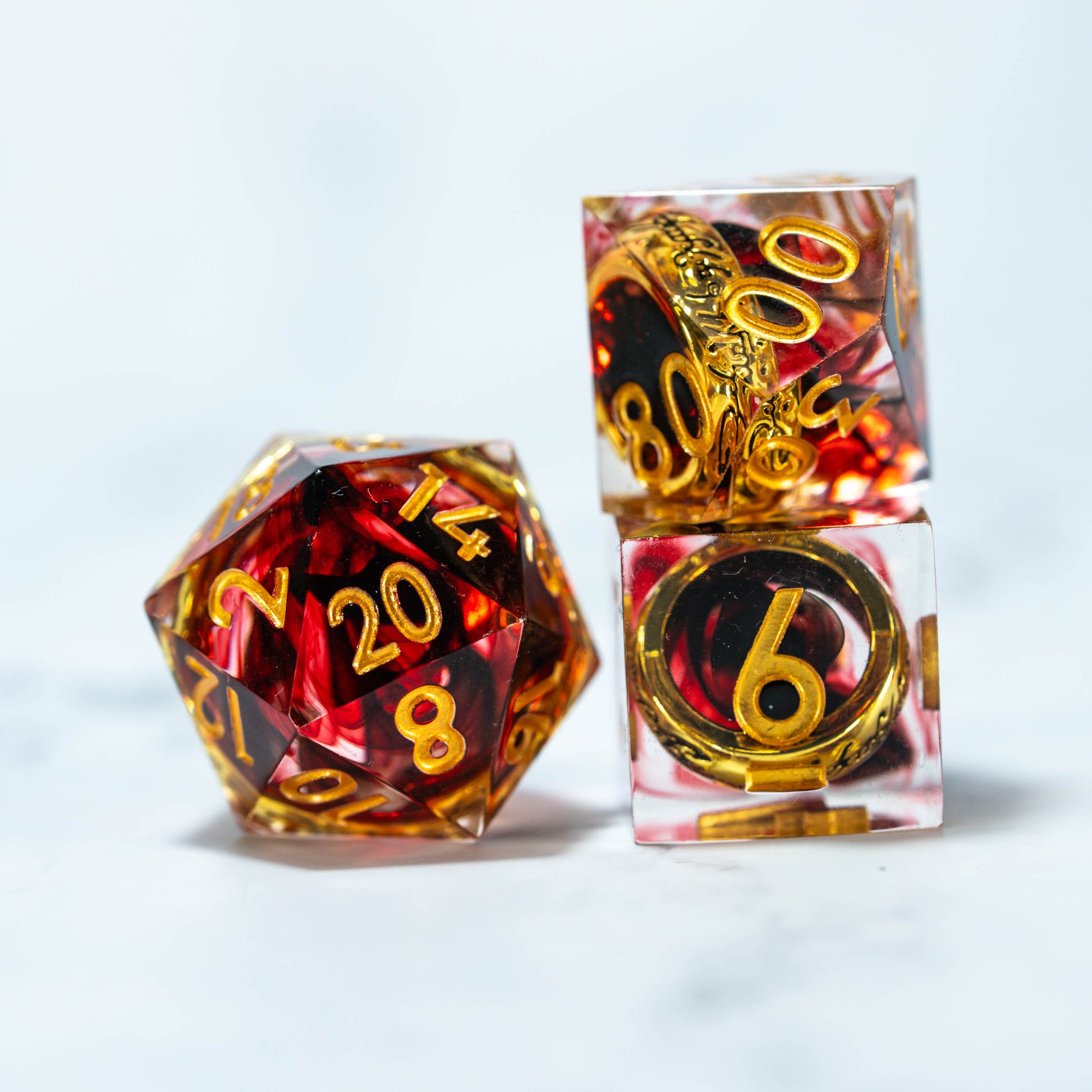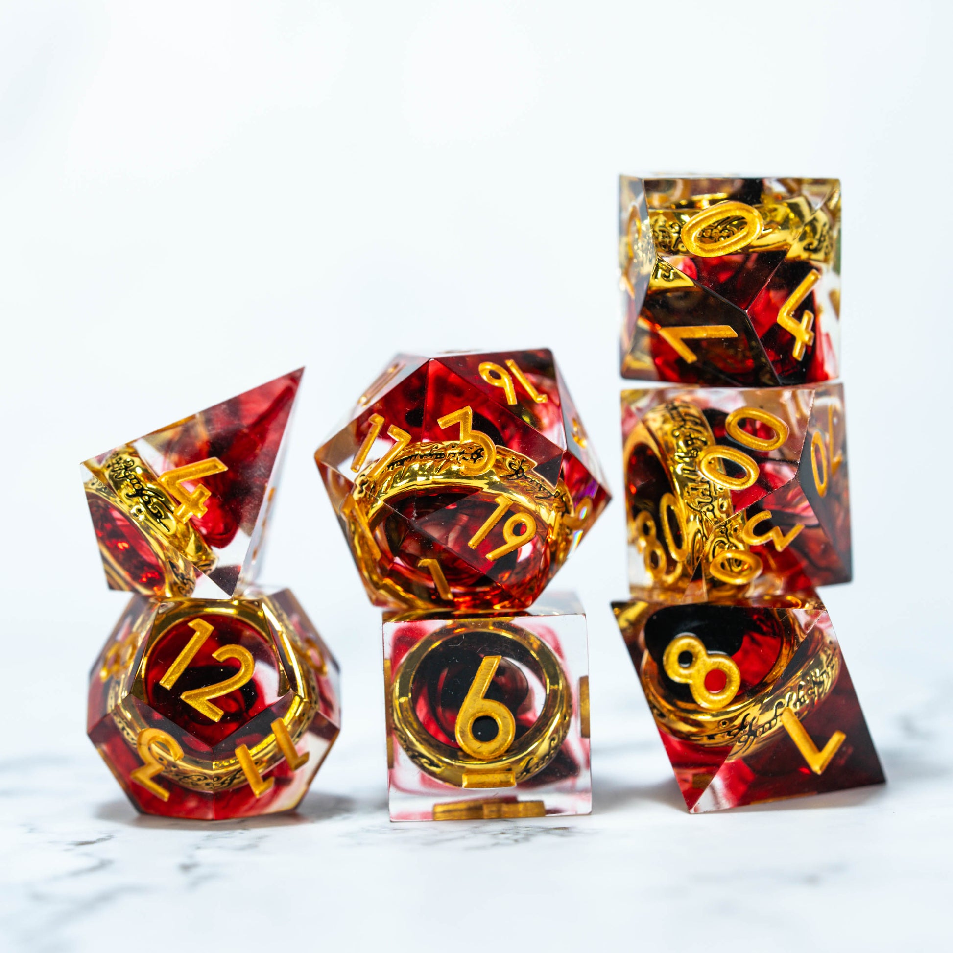 Ringe des Herrn ist ein Satz RPG-Würfel in Harz mit scharfen Kanten. Jeder Würfel enthält in seiner Mitte einen Ring.