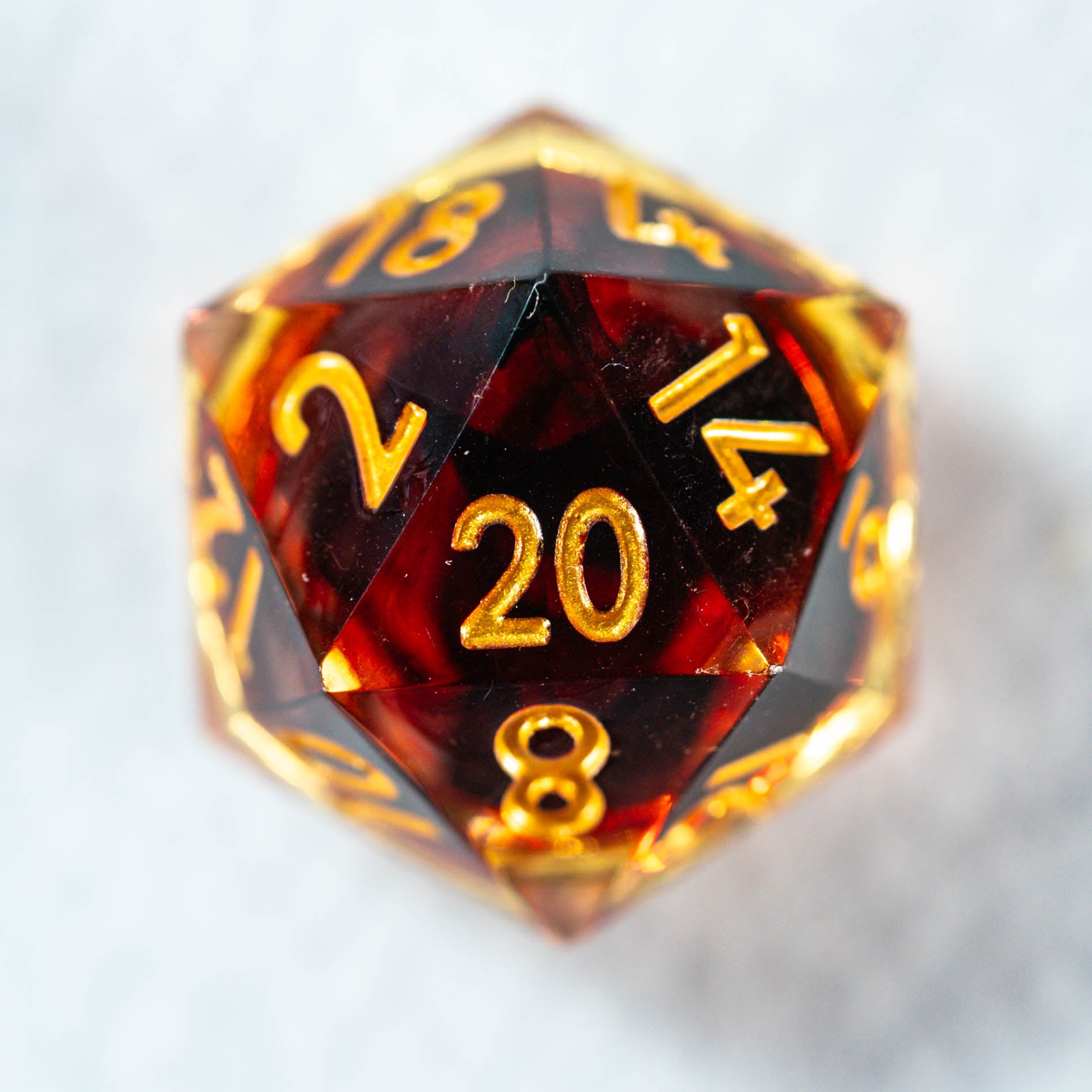 Jedes The Hoard-Würfelset ist ein Unikat, da es von Hand hergestellt, geschliffen, poliert und graviert wird.