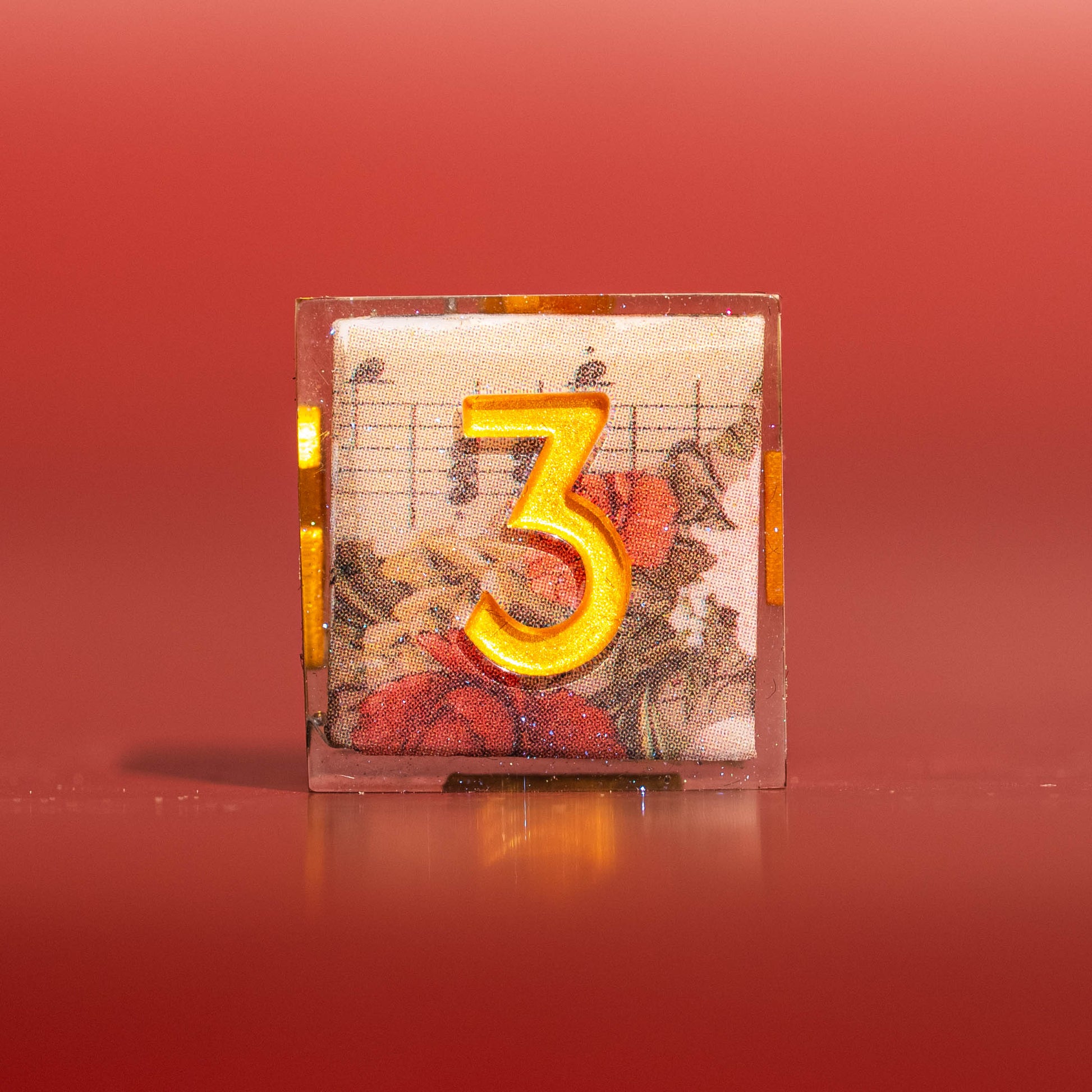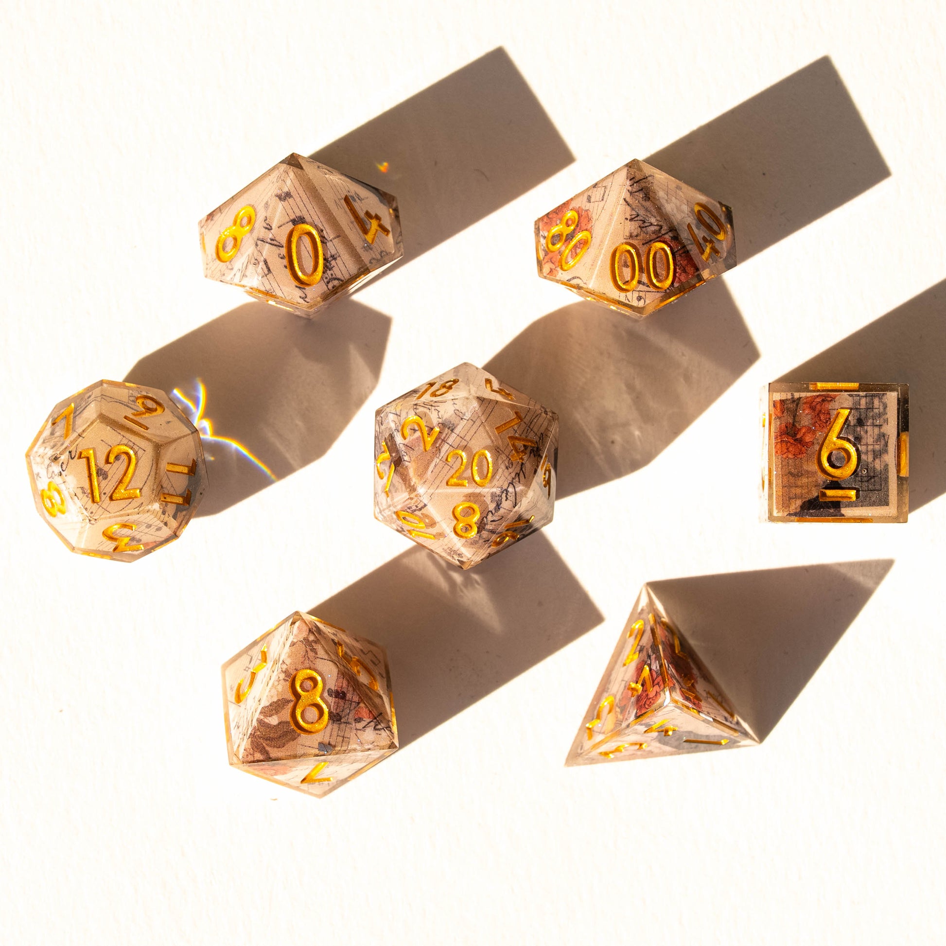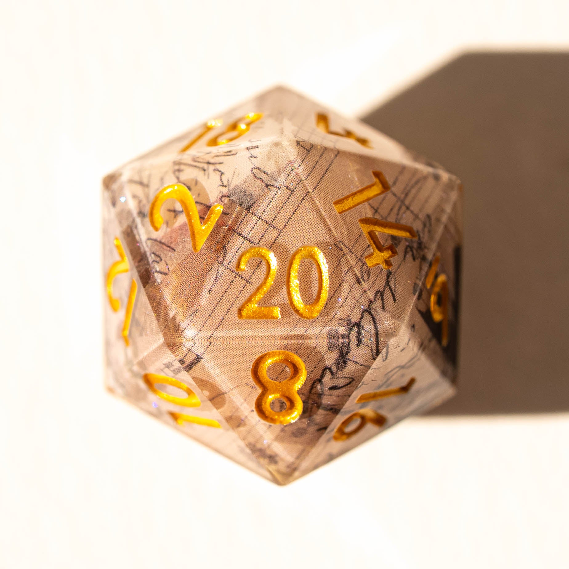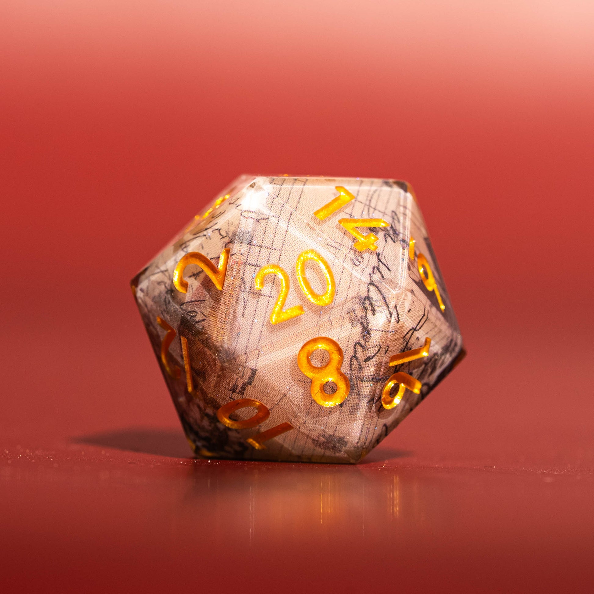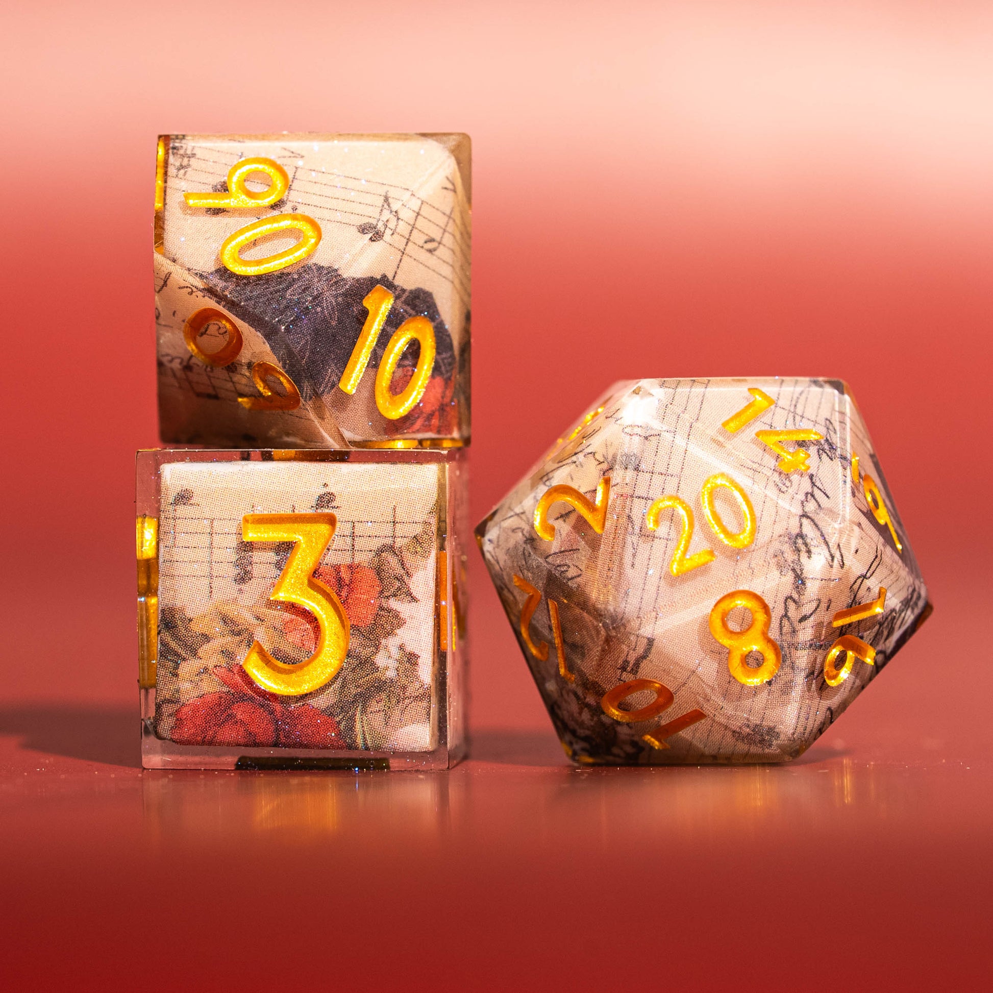 Ce set délicat, sculpté en strates, dévoile un layer raffiné où se mêlent partitions anciennes, calligraphies effacées et fleurs d’un autre temps. Enveloppé d’une couche de résine transparente, chaque dé semble capturer l’écho d’un air oublié, un murmure d’harmonie figé dans le cristal. Les chiffres dorés vibrent comme des notes suspendues, illuminant chaque lancer d’un éclat poétique.