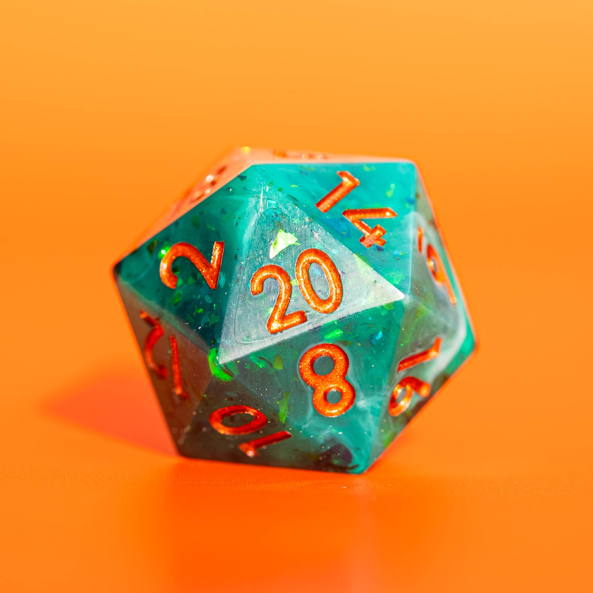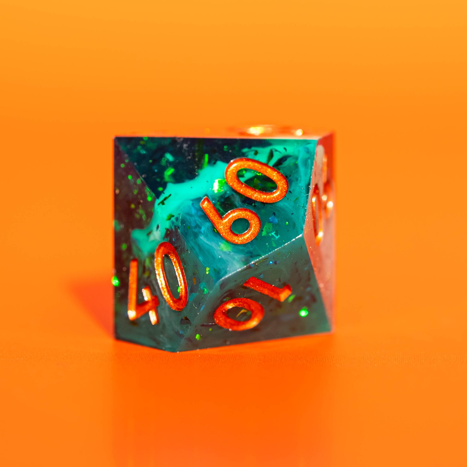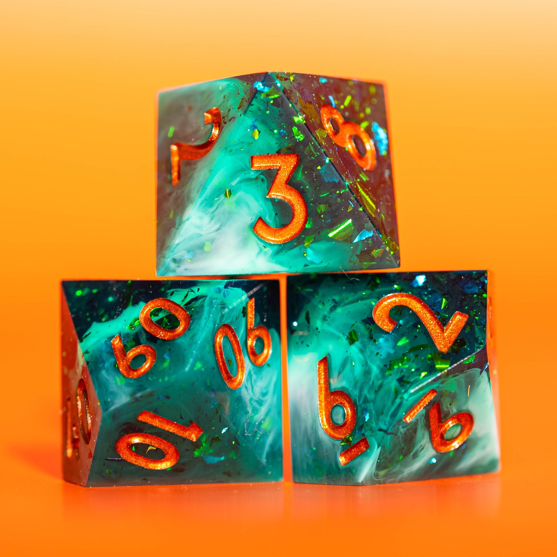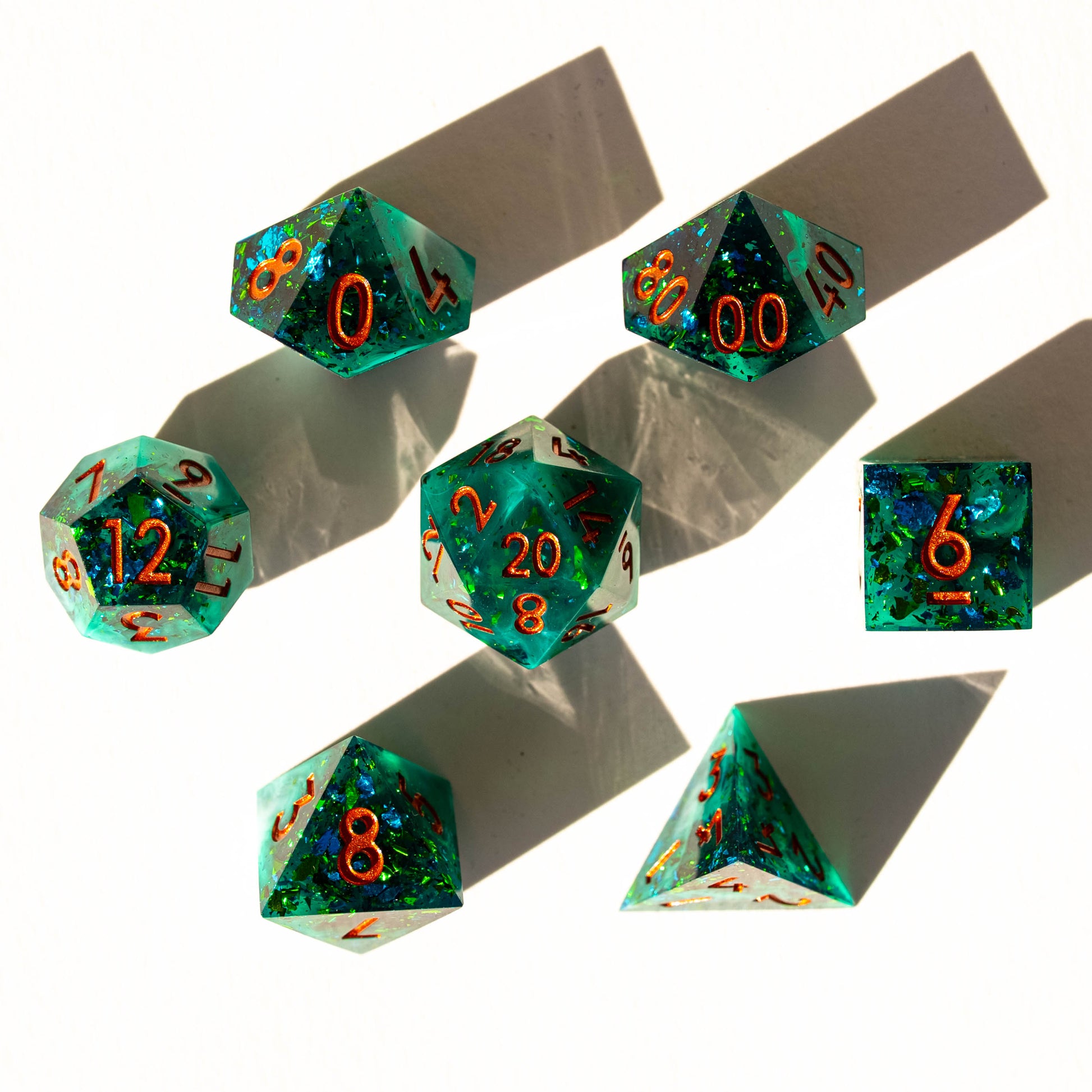 Brume d’Émeraude est un set de dés JDR en résine à bords tranchants.