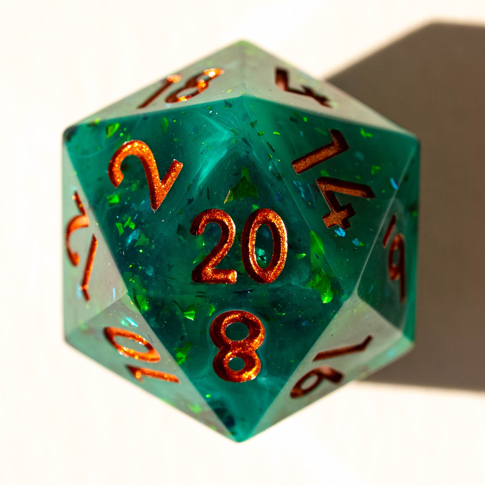 Ce set envoûtant aux teintes vertes profondes, rehaussées de volutes vert clair et d'inclusions iridescentes, évoque la respiration silencieuse d’une forêt enchantée. Comme une brume mystérieuse traversant les feuillages au petit matin, ces dés capturent la beauté éphémère de la nature en éveil. À chaque lancer, des reflets changeants dansent sous vos yeux, comme si la magie de la forêt elle-même vous accompagnait.