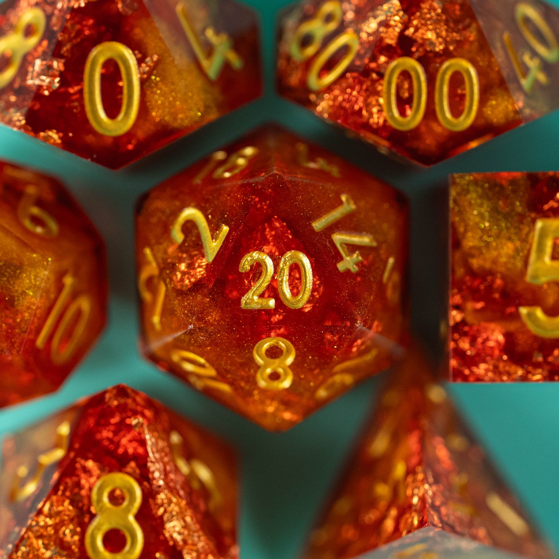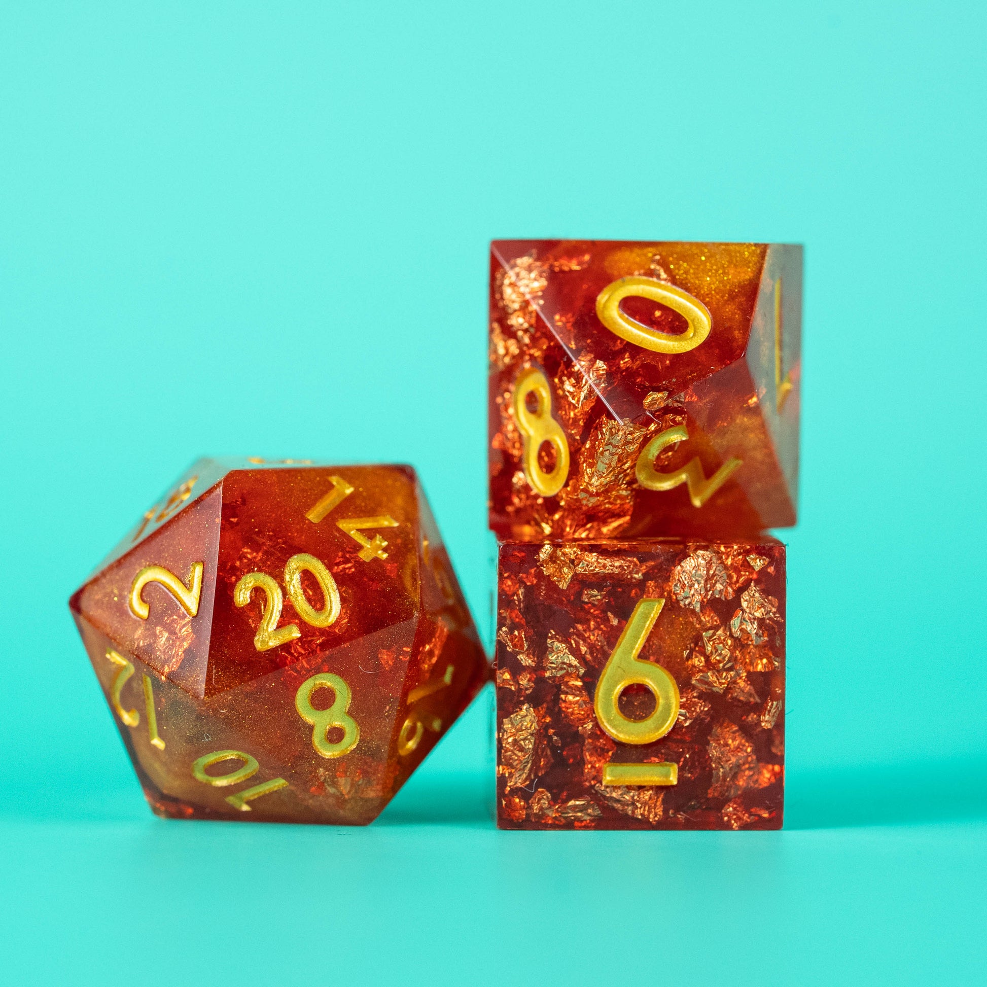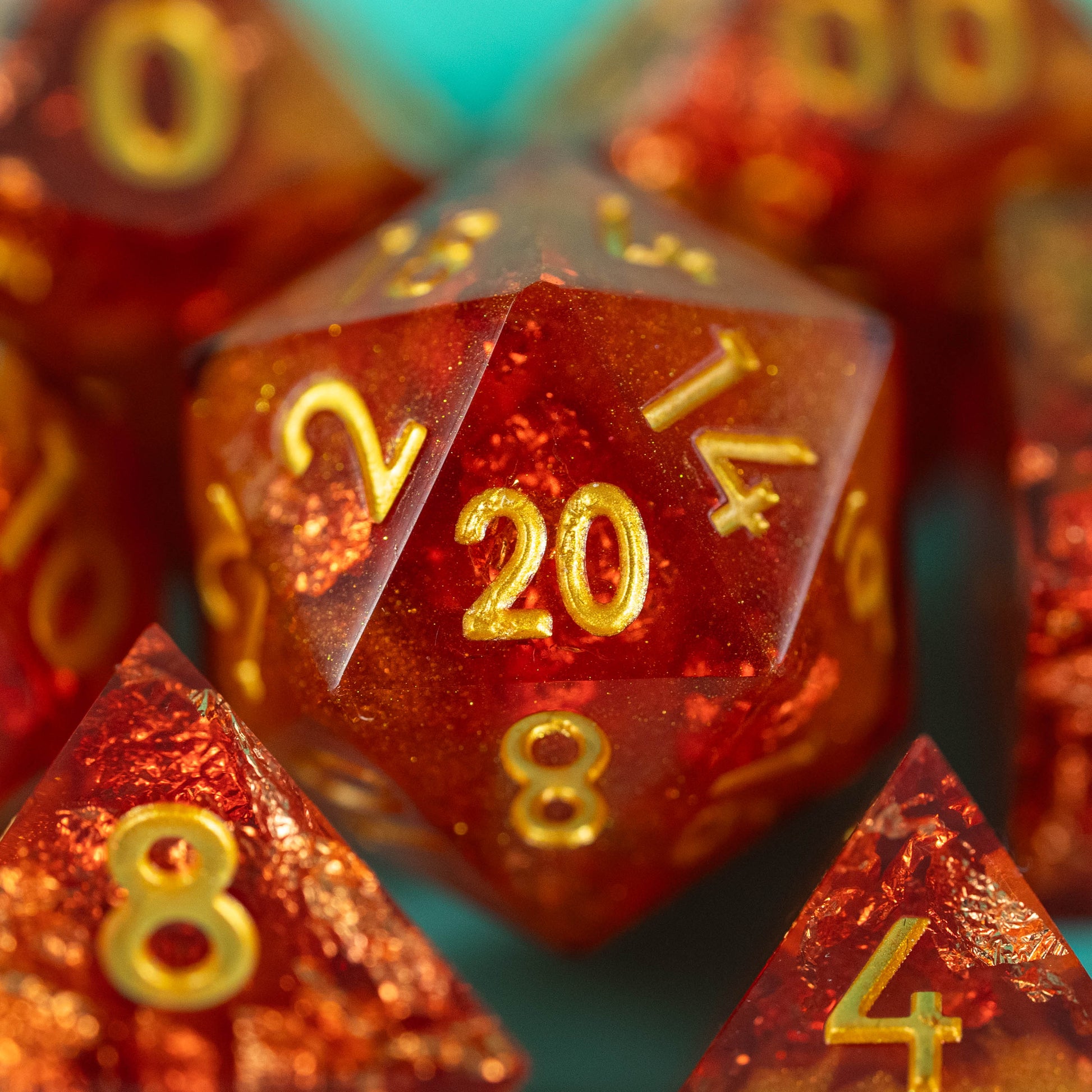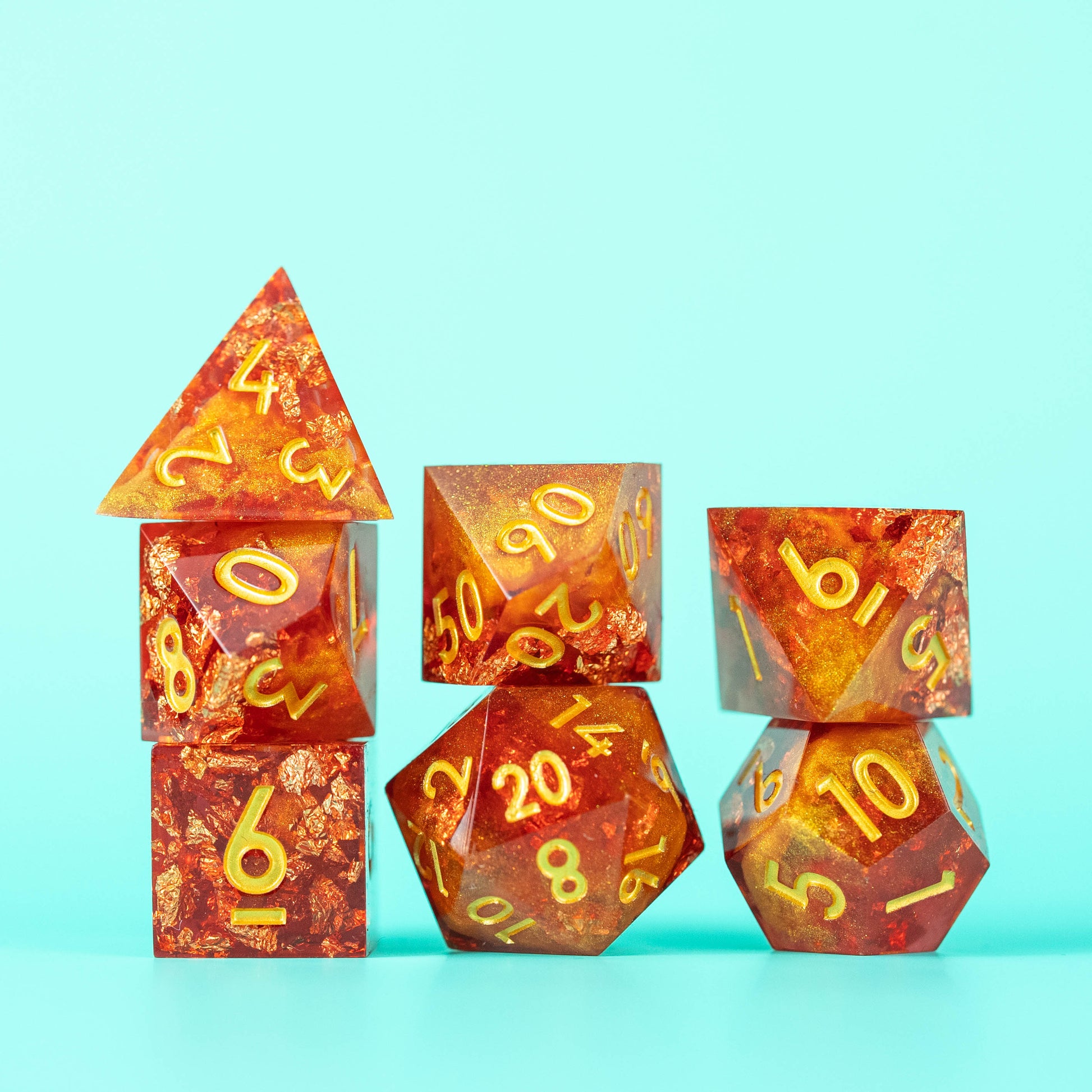 Tel un crépuscule en fusion, les Larmes du Soleil capturent l’éclat ardent d’un astre à son apogée. Ce set de dés en résine à bord tranchant mêle avec élégance des tourbillons d’orange incandescent, de jaune solaire et de rouge flamboyant, créant un effet de braises éternelles en suspension. De fines pailletes dorées scintillent à travers la résine translucide, évoquant les dernières lueurs d’un soleil mourant ou les éclats d’une flamme divine.