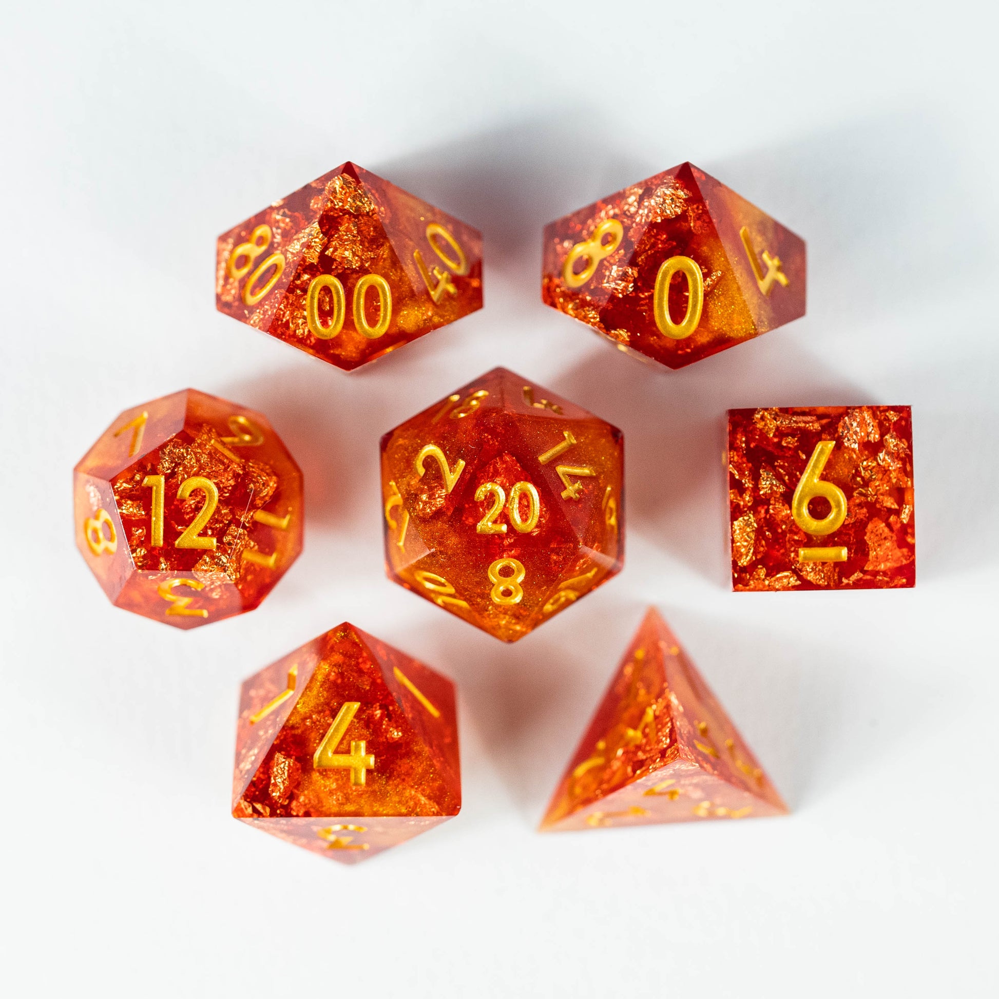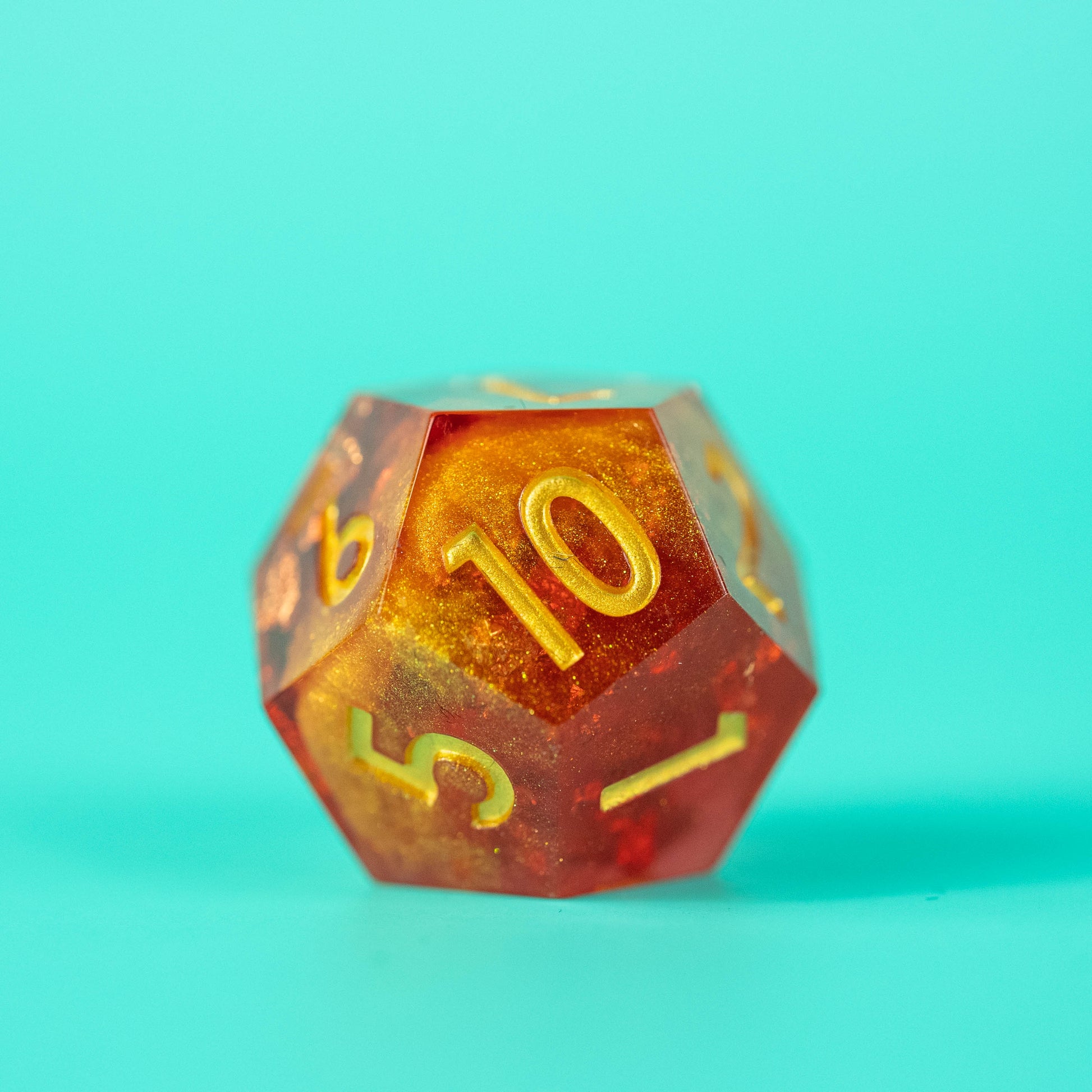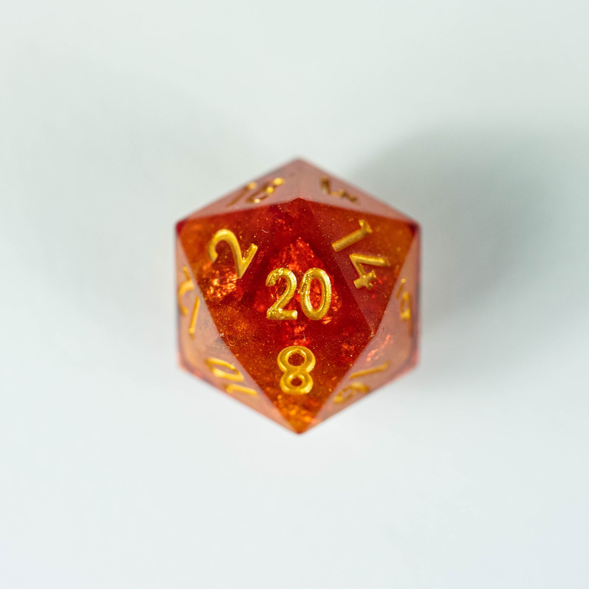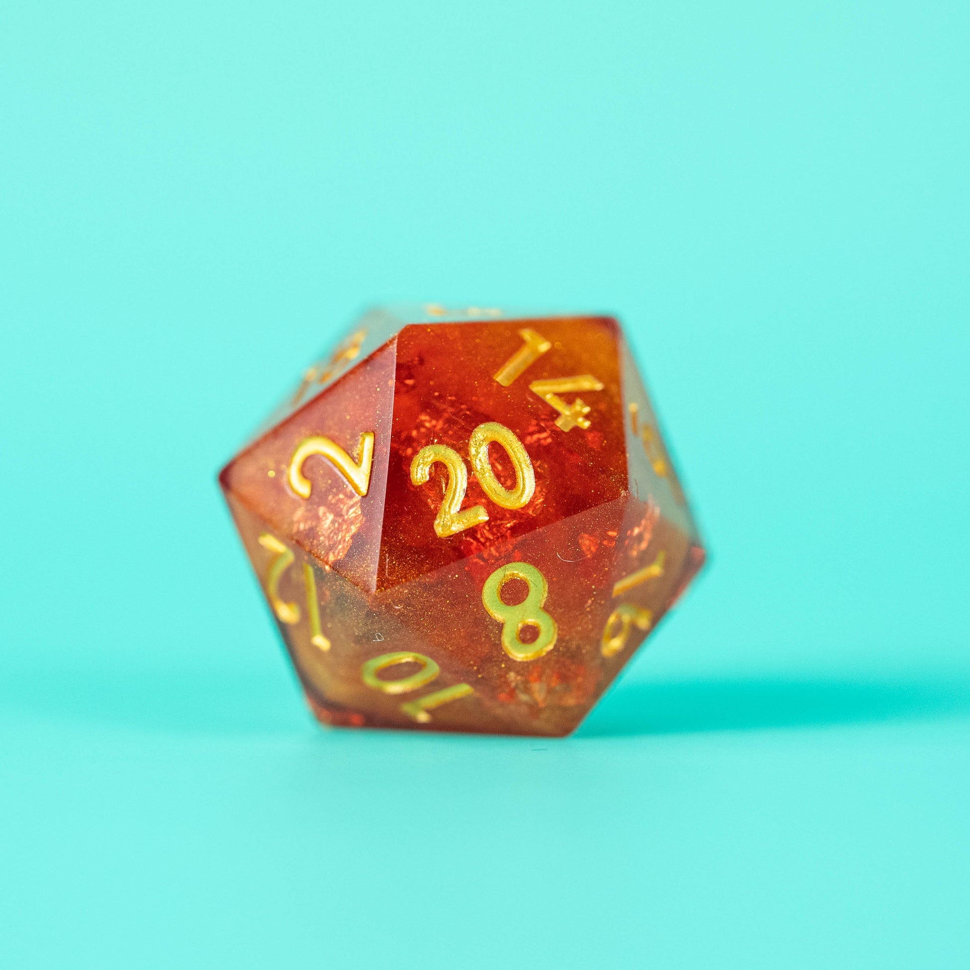 Tel un crépuscule en fusion, les Larmes du Soleil capturent l’éclat ardent d’un astre à son apogée. Ce set de dés en résine à bord tranchant mêle avec élégance des tourbillons d’orange incandescent, de jaune solaire et de rouge flamboyant, créant un effet de braises éternelles en suspension. De fines pailletes dorées scintillent à travers la résine translucide, évoquant les dernières lueurs d’un soleil mourant ou les éclats d’une flamme divine.