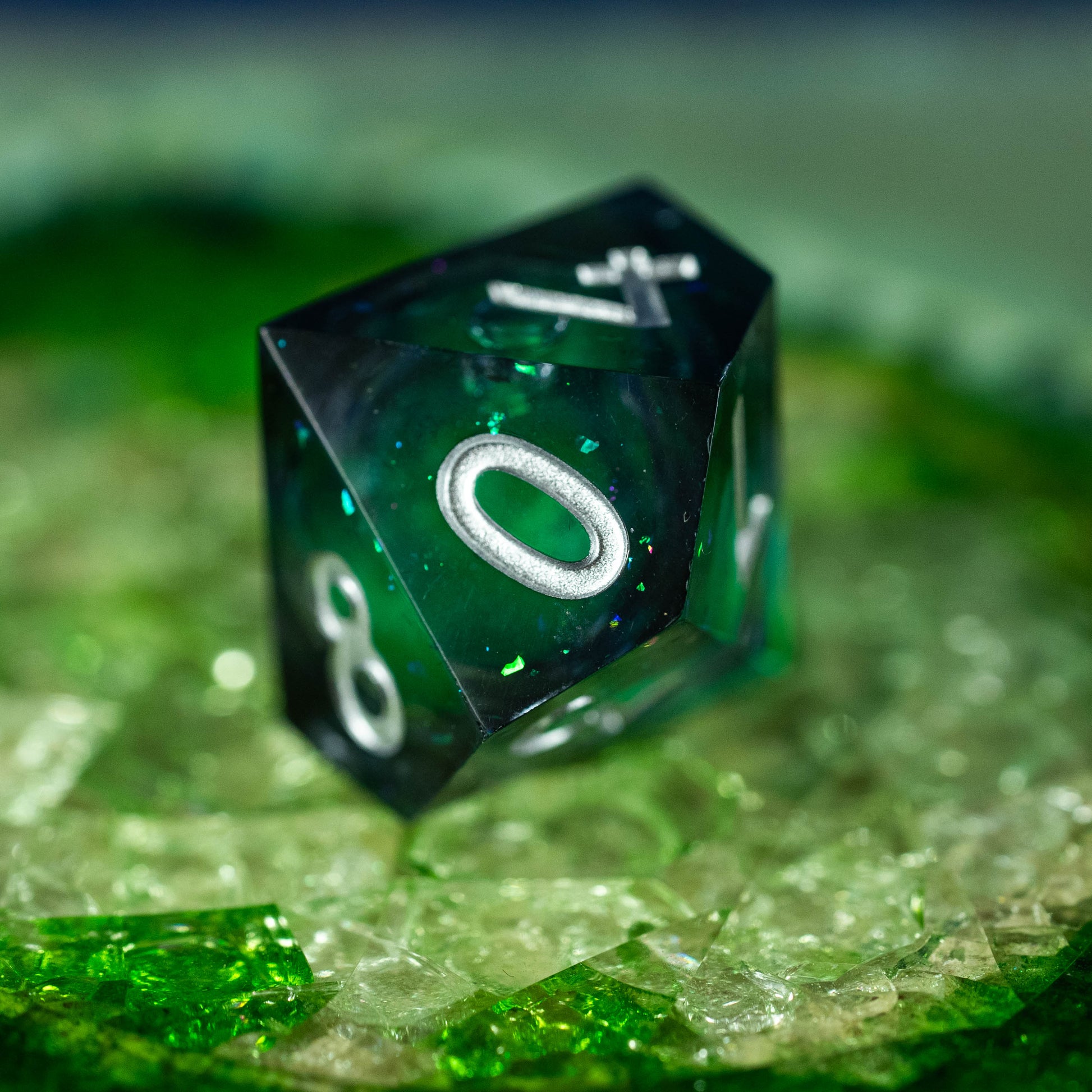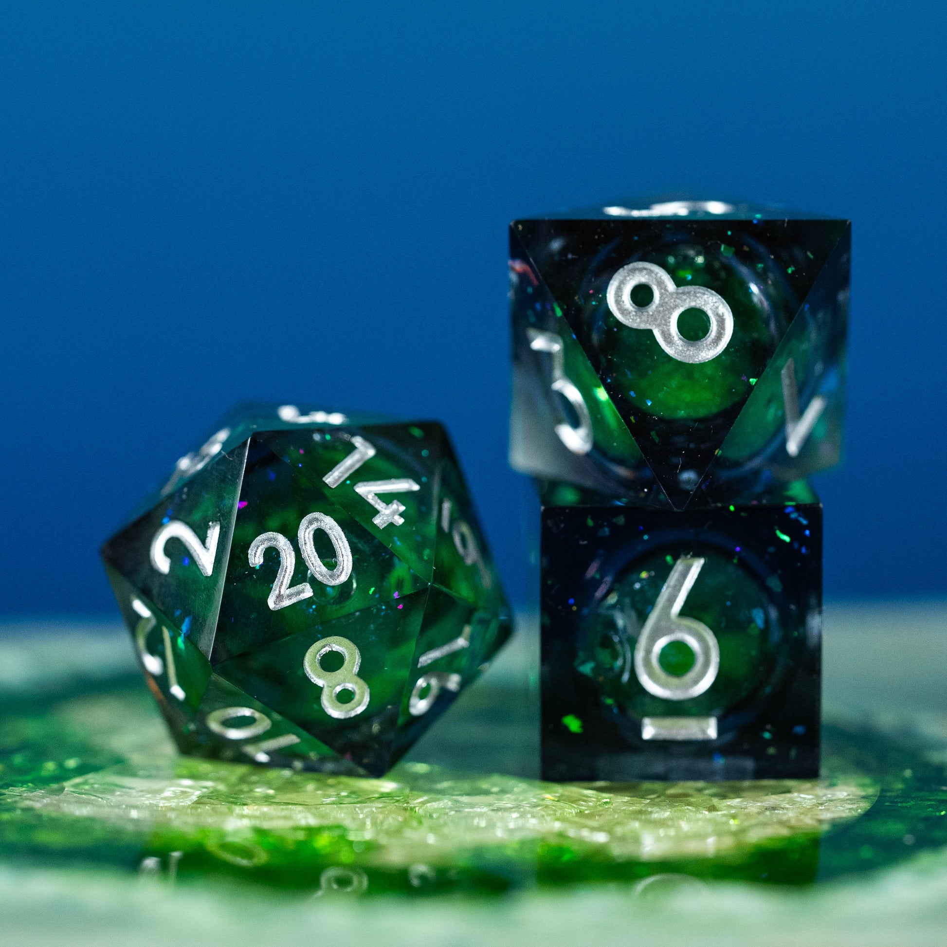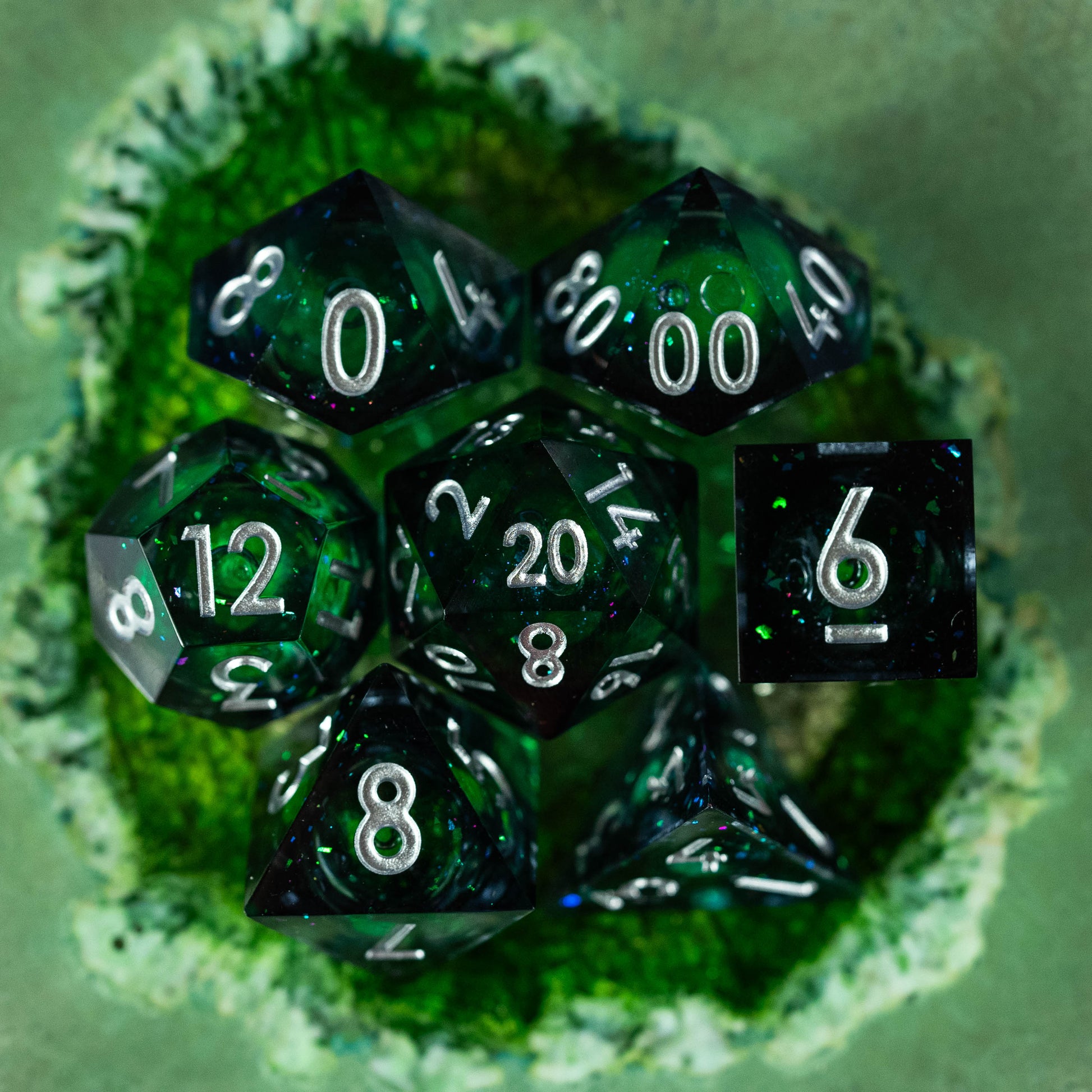Le set de dés "Cœur d'Yggdrasil" capture l'essence même de l'Arbre-Monde légendaire. Chaque dé, teinté de fumées mystérieuses, dévoile en son cœur un liquide vert scintillant de paillettes lumineuses, évoquant la sève mystique qui coule dans les racines d'Yggdrasil.