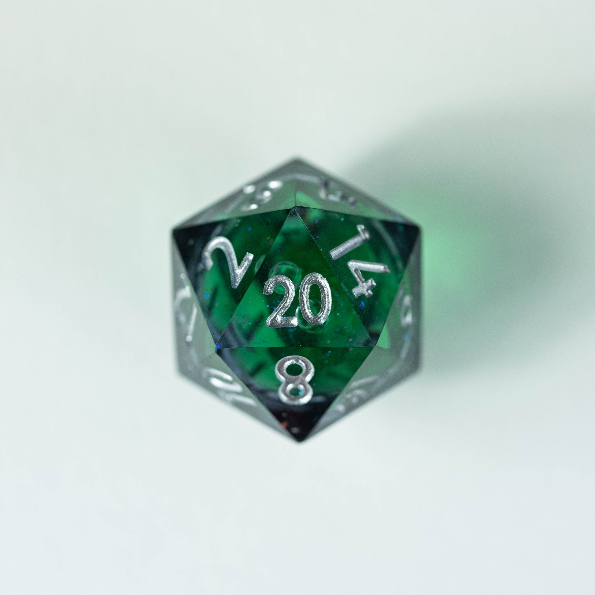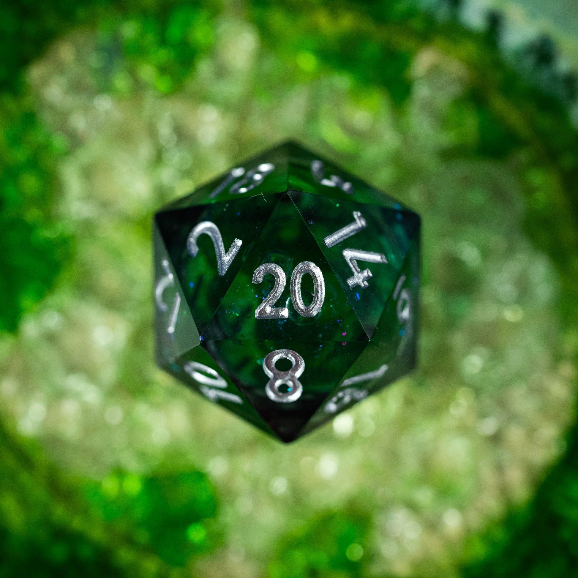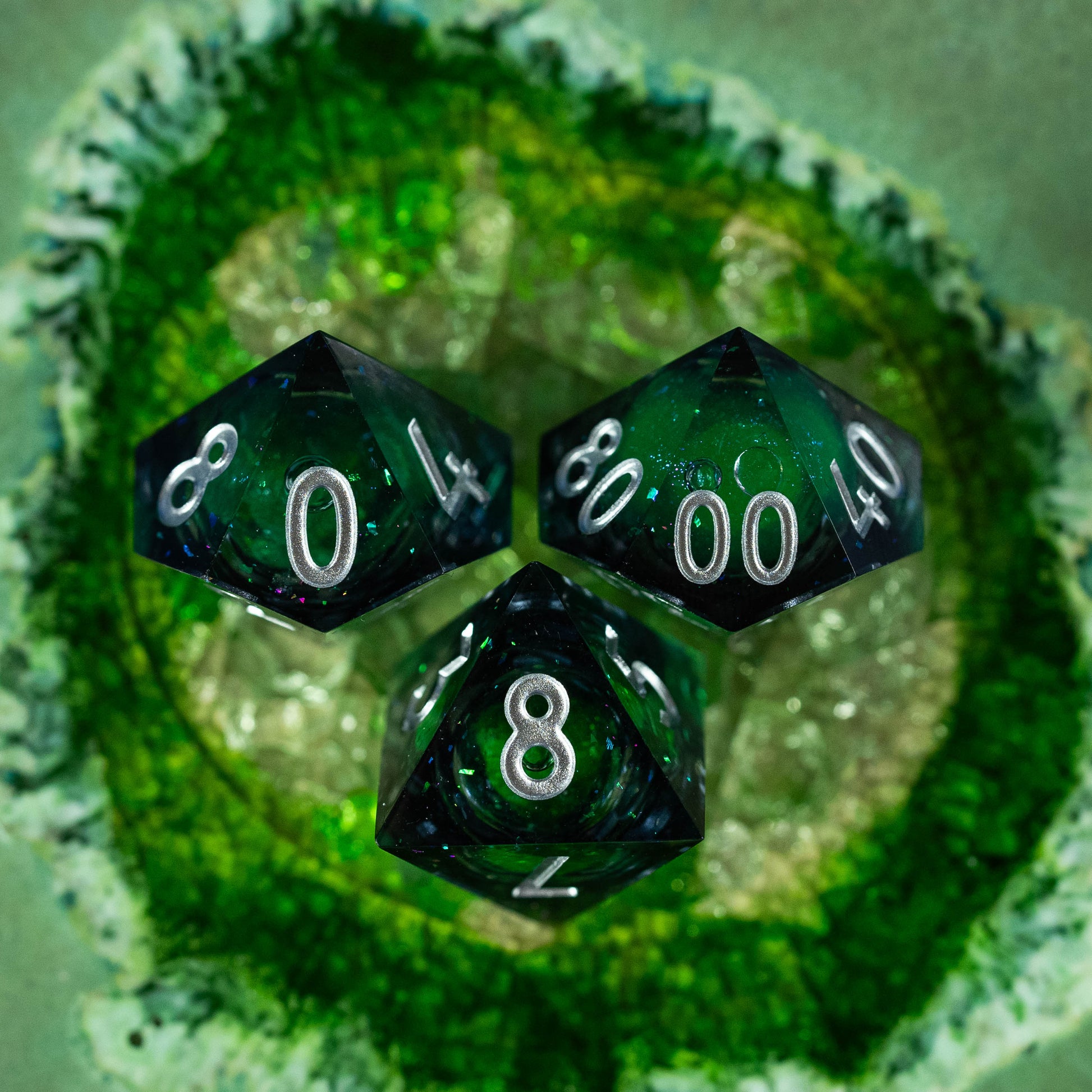 Le set de dés "Cœur d'Yggdrasil" capture l'essence même de l'Arbre-Monde légendaire. Chaque dé, teinté de fumées mystérieuses, dévoile en son cœur un liquide vert scintillant de paillettes lumineuses, évoquant la sève mystique qui coule dans les racines d'Yggdrasil.