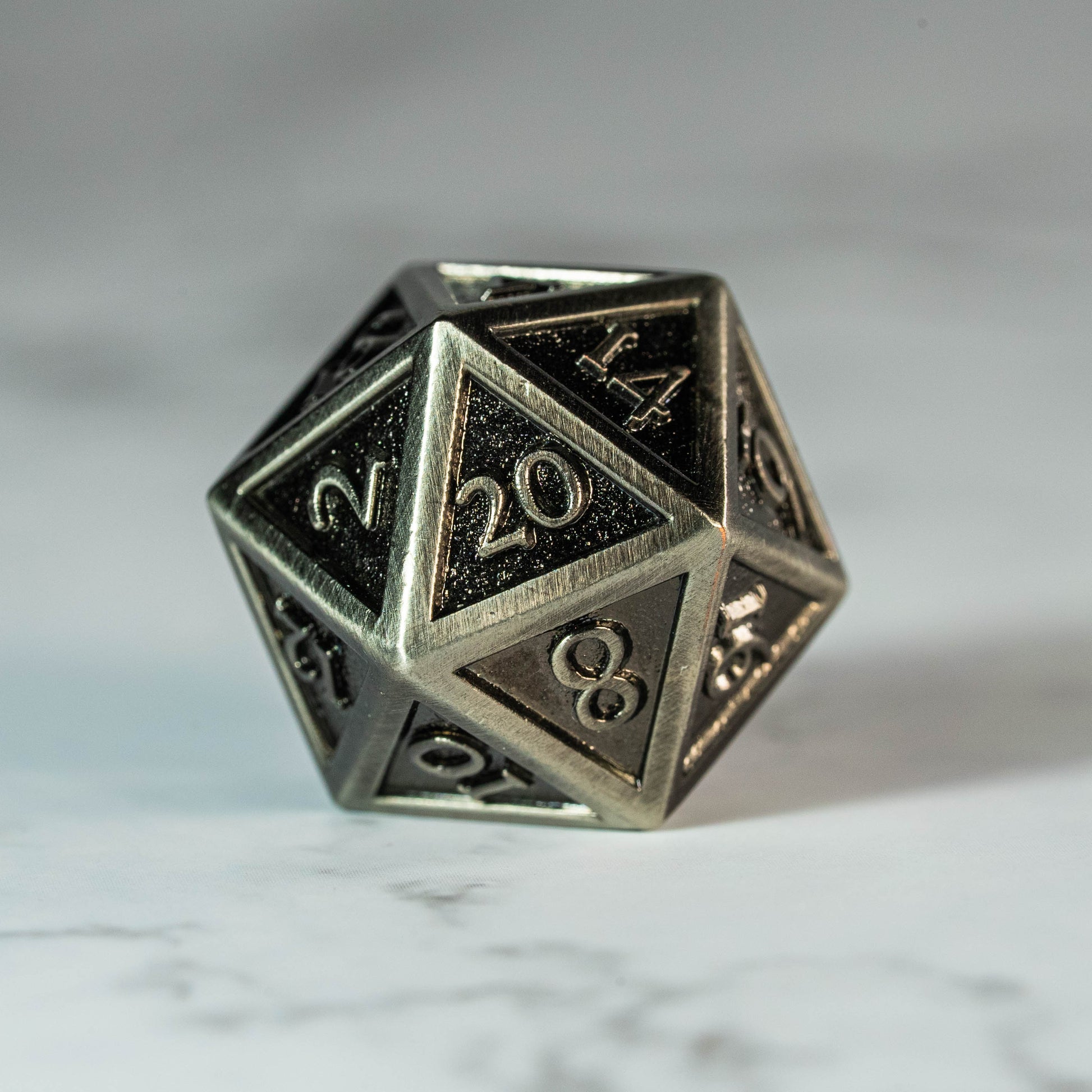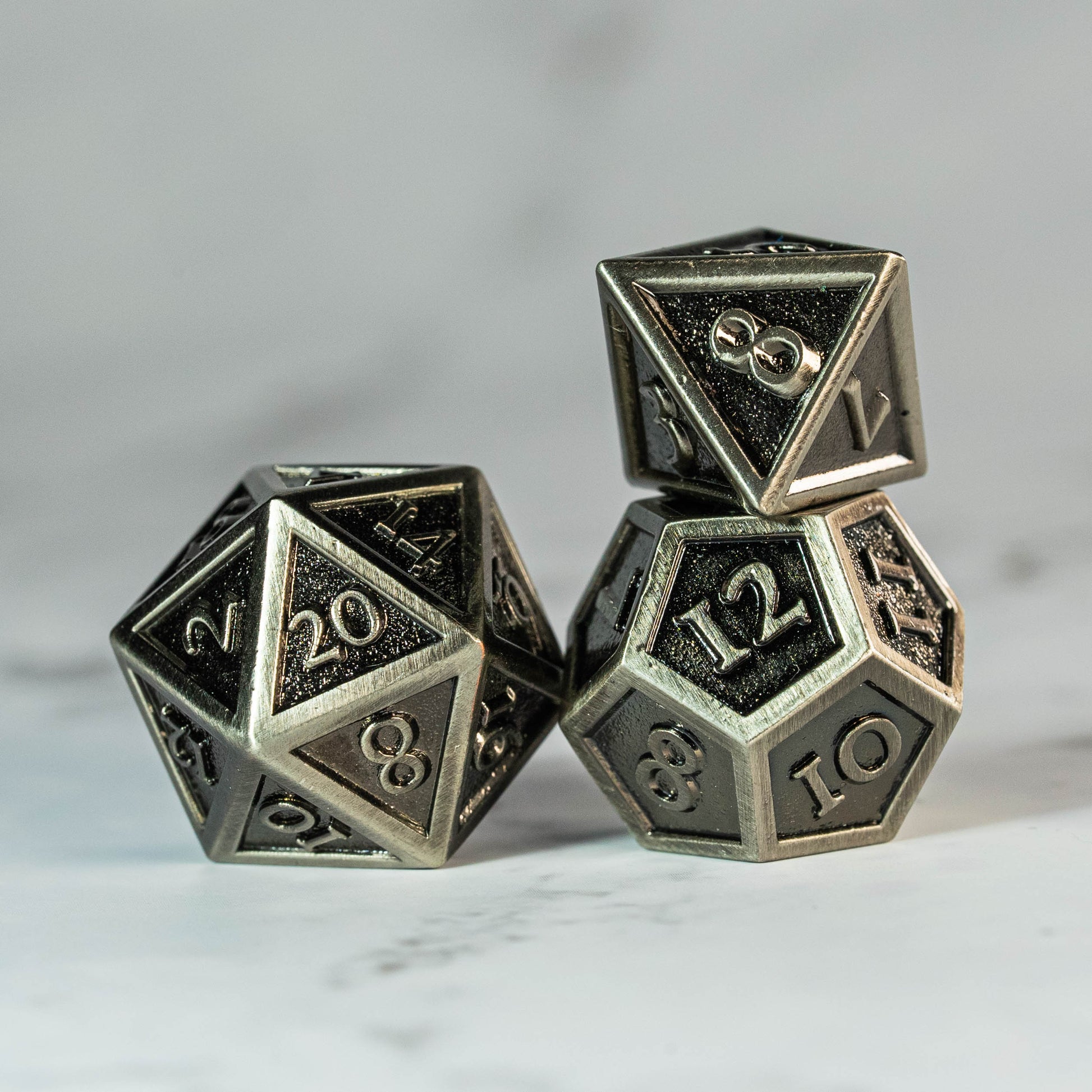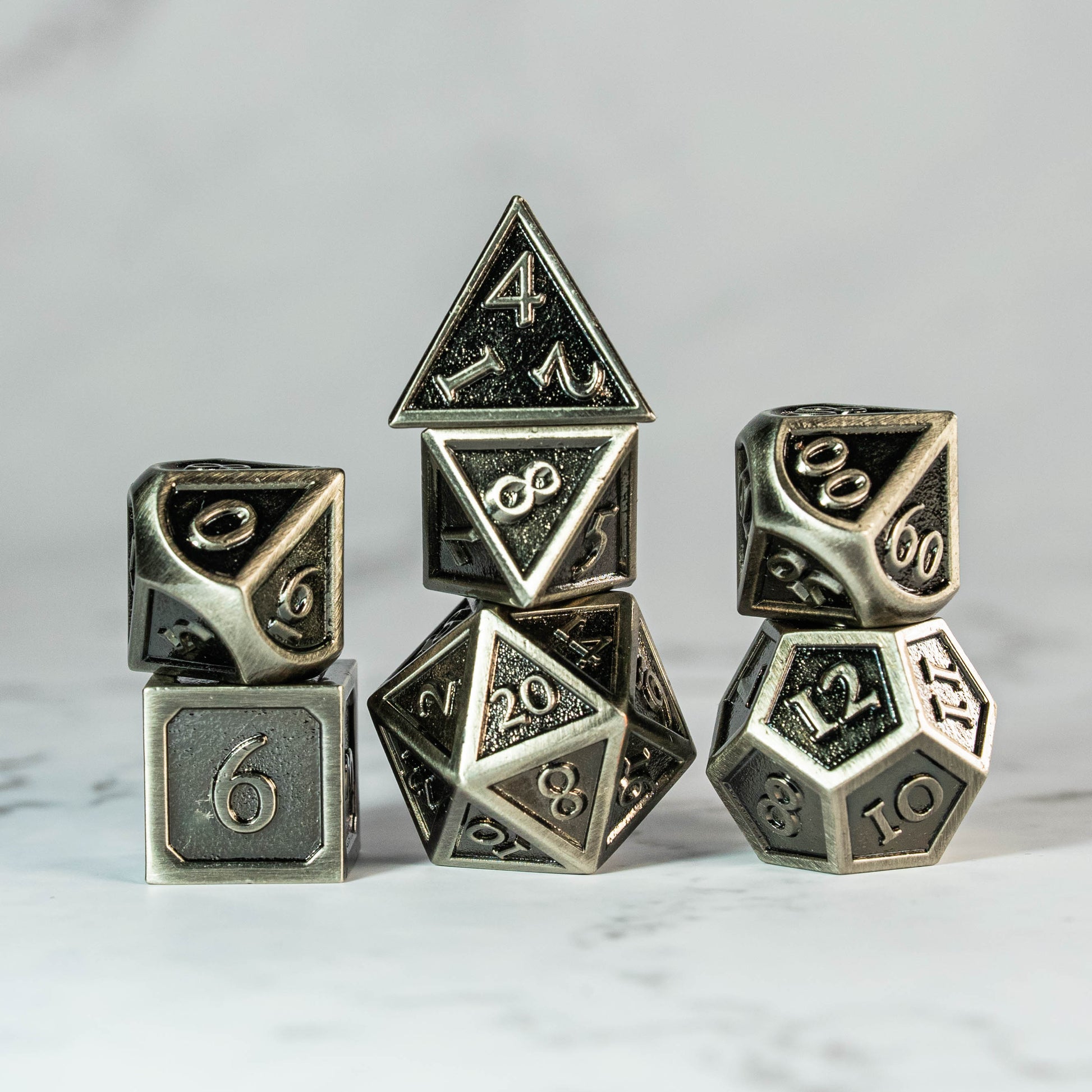 This set of metal RPG dice in Antique Nickel color and legends . It is made up of 7 polyhedral dice made for tabletop role-playing games. The dice in this set are slightly smaller than the standard format.