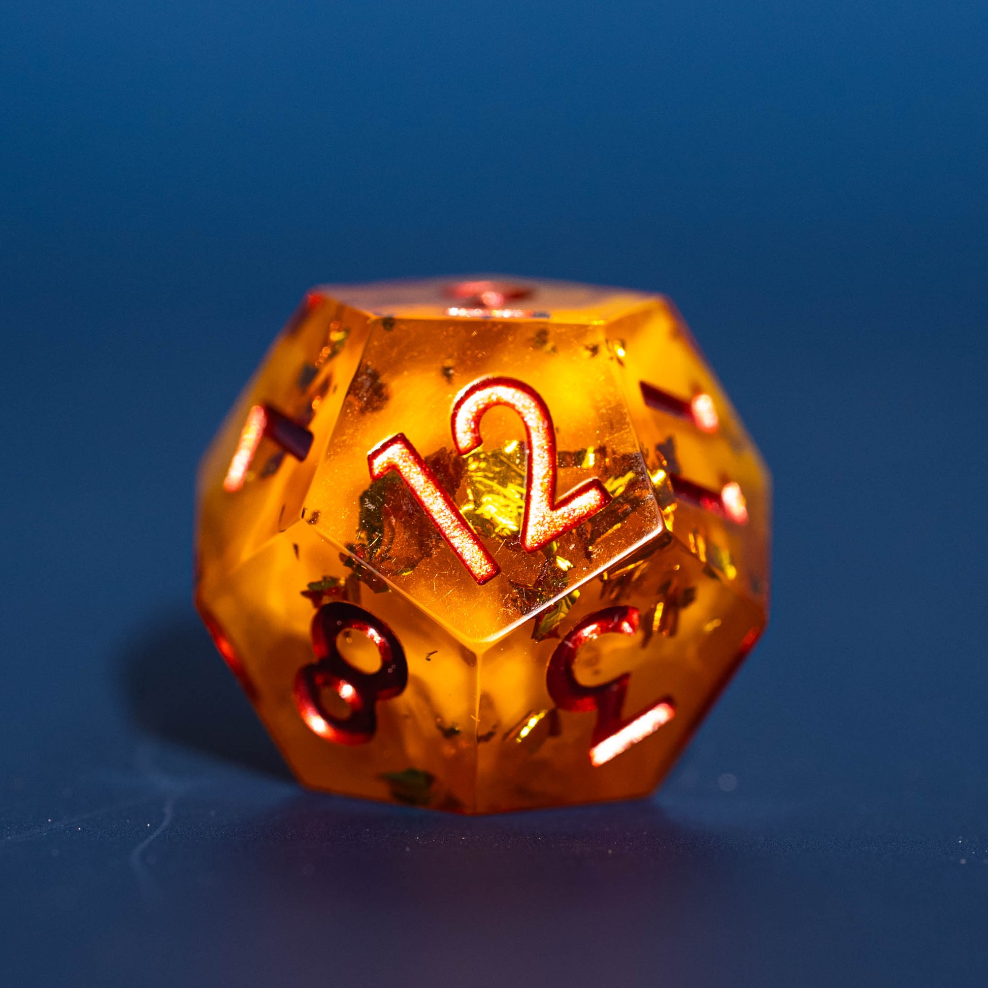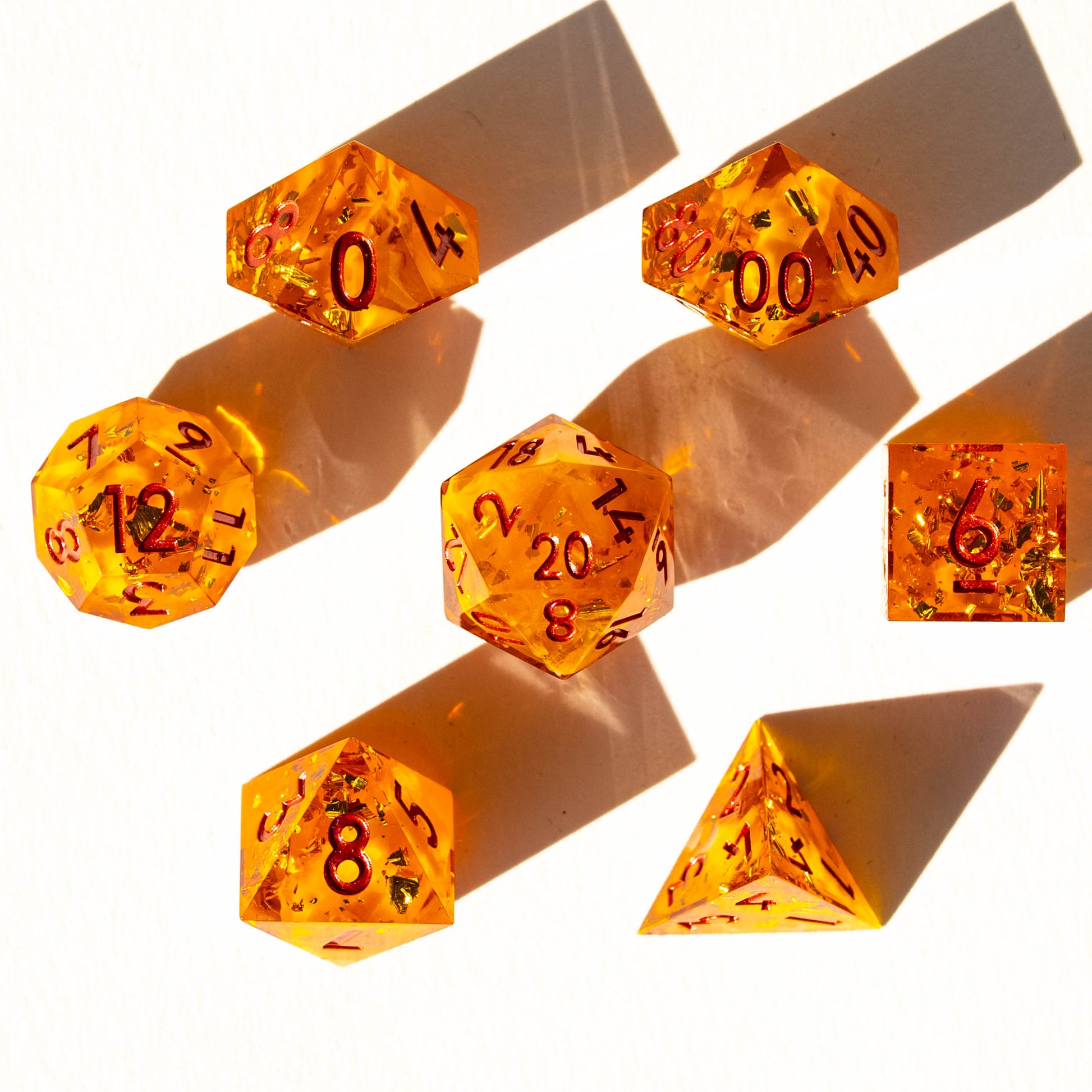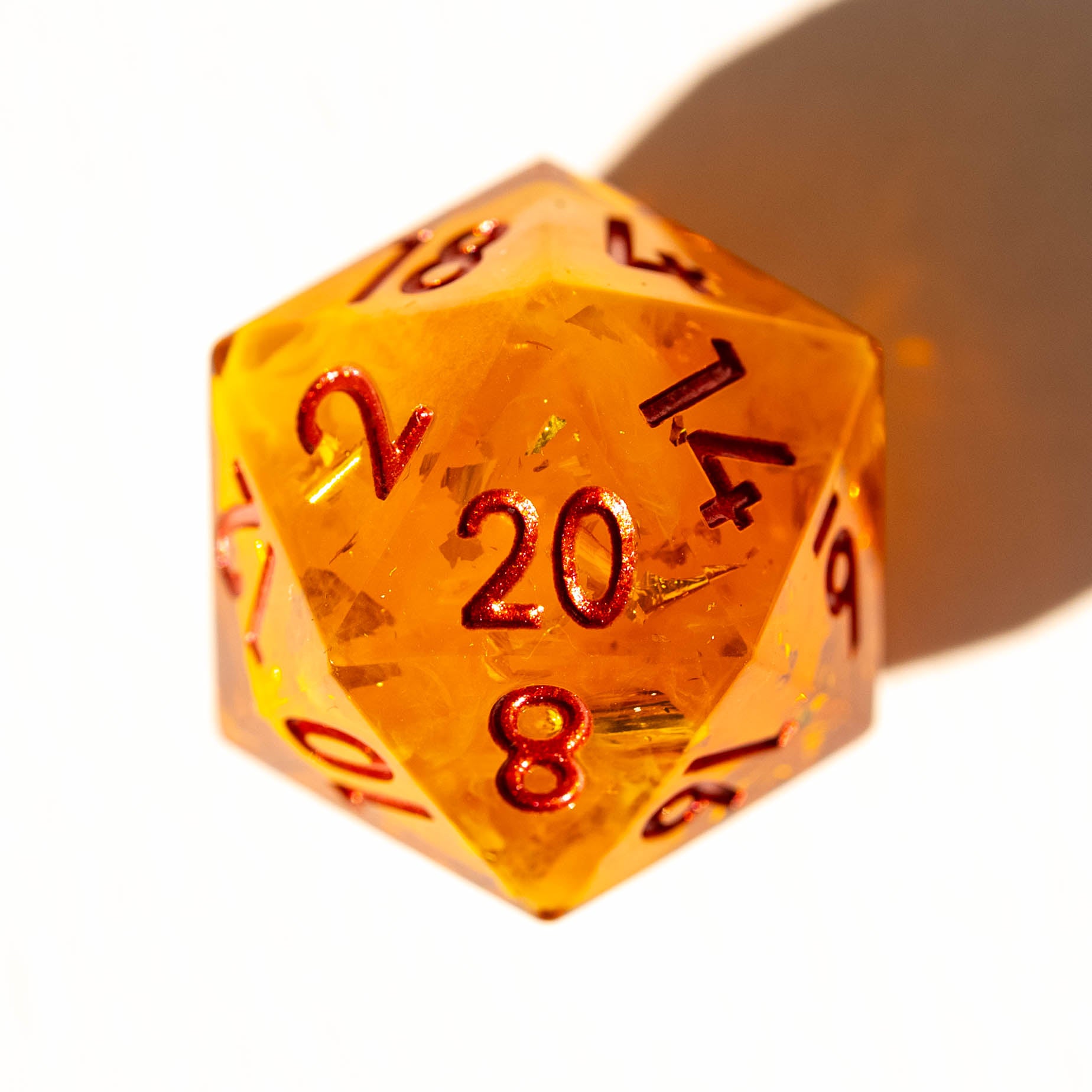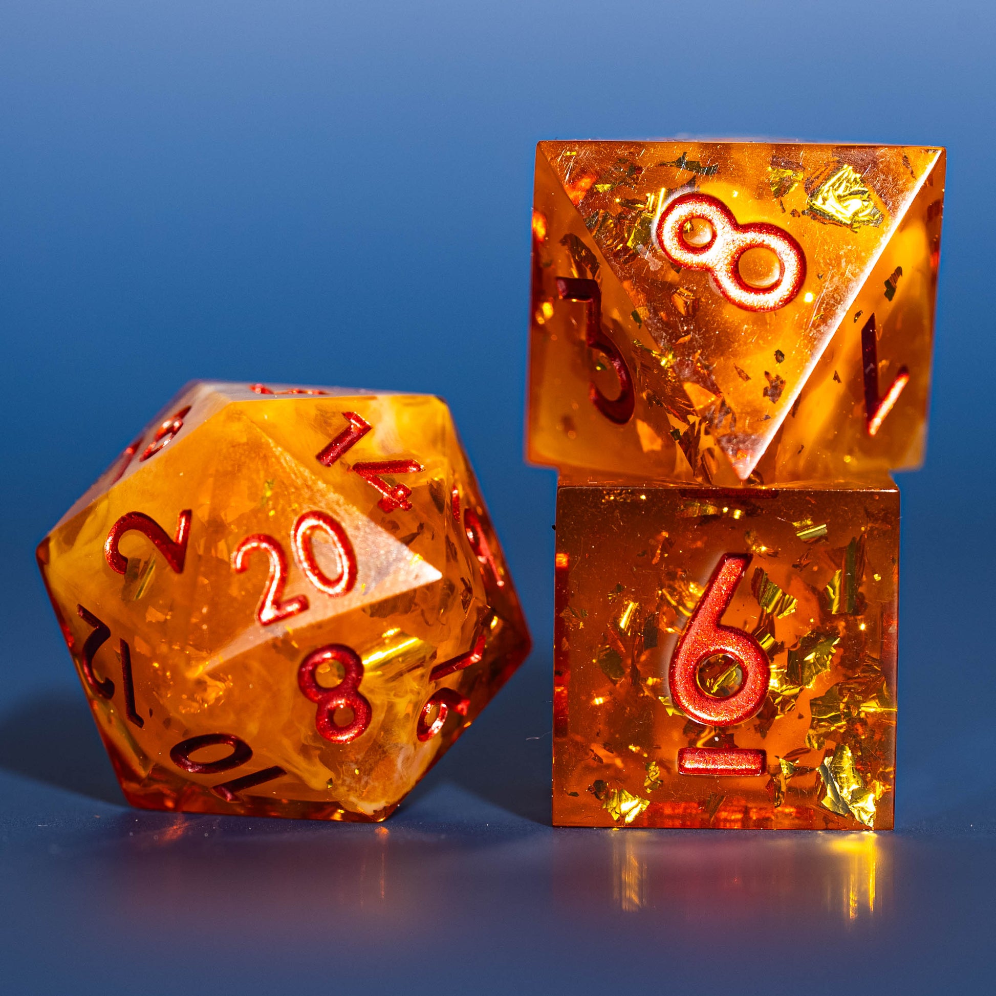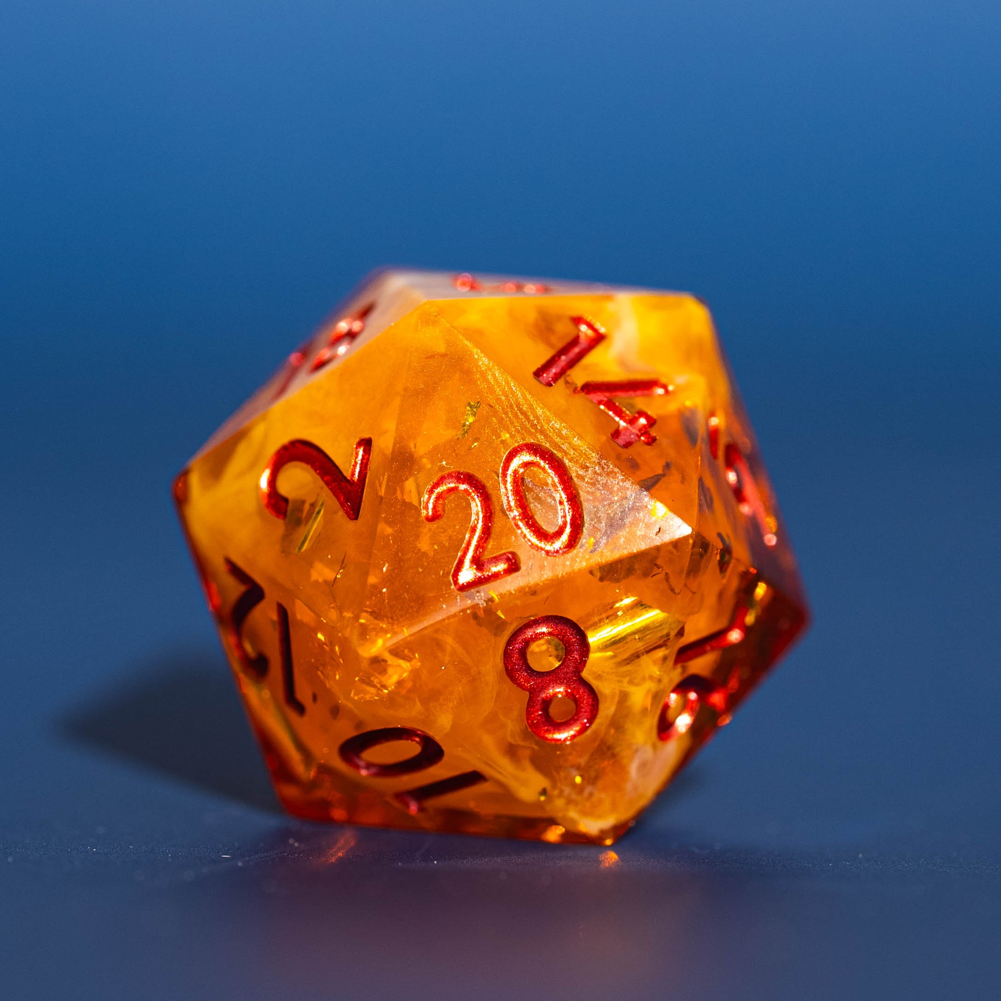 Ce set flamboyant aux teintes orange transparentes, traversées de volutes laiteuses et parsemé de paillettes dorées, évoque des feux mystiques dansants au cœur du plan astral. Comme des braises suspendues entre deux mondes, ces dés brillent d’une chaleur surnaturelle, douce mais indomptable. Chaque lancer semble invoquer une flamme oubliée, une étincelle d’énergie pure venue des confins de la magie.