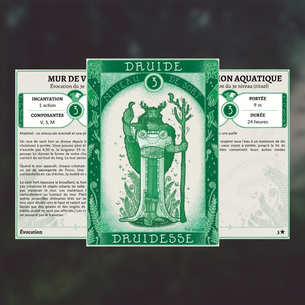 Gardez toutes vos connaissances arcaniques à portée de main avec ces cartes de sorts pour Druide et Druidesse compatibles avec la 5E. Le contenu de ces cartes vient de la traduction officielle du SRD de Donjons & Dragons par Wizards of the Coast en français, disponible gratuitement ici.