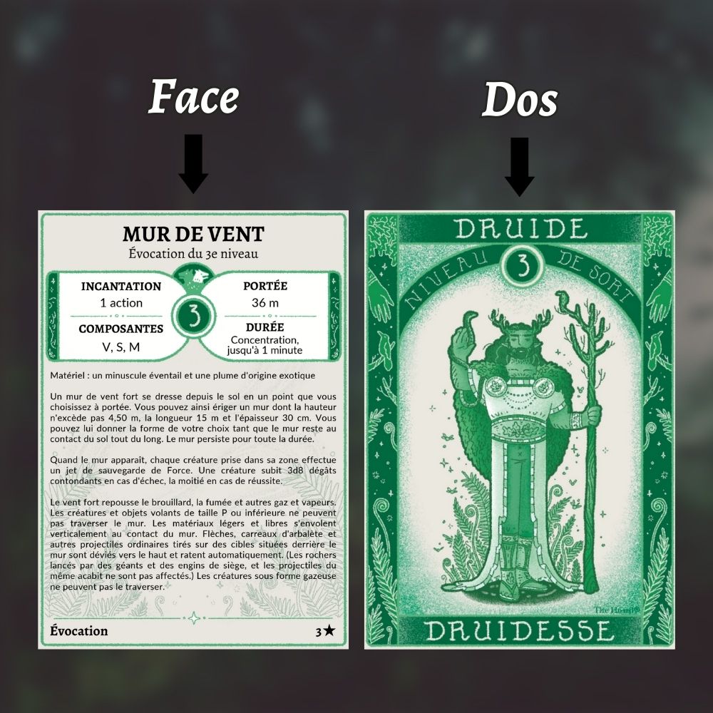 Ce jeu de cartes contient tous les sorts de Druide / Druidesse : Agrandissement/rapetissement, Alarme, Animation des morts, Animation des objets, Anticipation, Antidétection, Apparence trompeuse, Appel de familier, Arme magique, Armure du mage, Arrêt du temps, Aspersion acide, Assassin imaginaire, Aura magique de l’arcaniste, Aversion/attirance, Bannissement, Bouche magique, Bouclier, Bouclier de feu, Bouffée de poison, Boule de feu, Boule de feu à retardement, Bourrasque, Brume mortelle, Cage de force, Caresse du vampire, Cercle de mort, Cercle de téléportation, Cercle magique, Champ antimagie, Changement de forme, Changement de plan, Charme-personne, Chaîne d’éclairs, Chien de garde, Clairvoyance, Clignotement, Clone, Coffre secret, Communication à distance, Compréhension des langues, Confusion, Contact avec les plans, Contact glacial, Contresort, Contrôle de l’eau, Contrôle du climat, Convocations instantanées, Corde enchantée, Couleurs dansantes, Coup au but, Création, Création de mort-vivant, Cécité/surdité, Cône de froid, Danse irrésistible, Demi-plan, Disque flottant, Dissimulation suprême, Dissipation de la magie, Doigt de mort, Domination de monstre, Domination de personne, Don des langues, Double illusoire, Doux repos, Déblocage, Dédale, Déguisement, Délivrance des malédictions, Désintégration, Détection de la magie, Détection de l’invisibilité, Détection des pensées, Éclair, Éclat du soleil, Embruns prismatiques, Emprisonnement, Ennemi subconscient, Entrave planaire, Épée arcanique, Esprit faible, Esprit impénétrable, Fabrication, Façonnage de la pierre, Feuille morte, Flamme éternelle, Flou, Flèche acide, Flétrissement, Forme gazeuse, Forme éthérée, Fou rire, Foulée brumeuse, Fracassement, Glissement de terrain, Globe d’invulnérabilité, Glyphe de garde, Graisse, Grande foulée, Hâte, Identification, Illusion mineure, Illusion programmée, Image majeure, Image miroir, Image projetée, Image silencieuse, Immobilisation de monstre, Immobilisation de personne, Inversion de la gravité, Invisibilité, Invisibilité suprême, Invocation d’élémentaire, Invocation d’élémentaires mineurs, Lenteur, Lien télépathique, Localisation de créature, Localisation d’objet, Lumière, Lumières dansantes, Lévitation, Main arcanique, Main du mage, Mains brûlantes, Malédiction, Manoir somptueux, Mauvais œil, Message, Mirage, Modification de mémoire, Modification d’apparence, Monture fantôme, Mot de pouvoir mortel, Mot de pouvoir étourdissant, Motif hypnotique, Mur de feu, Mur de force, Mur de glace, Mur de pierre, Mur prismatique, Mythes et légendes, Métamorphose, Métamorphose suprême, Nappe de brouillard, Nuage incendiaire, Nuage nauséabond, Nuée de météores, Œil du mage, Passe-muraille, Pattes d’araignée, Peau de pierre, Petite hutte, Poigne électrique, Portail, Porte dimensionnelle, Possession, Prestidigitation, Projectile magique, Projection astrale, Protection contre le mal et le bien, Protection contre l’énergie, Protections et sceaux, Prémonition, Pétrification, Quête, Rayon affaiblissant, Rayon ardent, Rayon de givre, Rayon de soleil, Repli expéditif, Respiration aquatique, Réparation, Sanctuaire privé, Saut, Scrutation, Serviteur invisible, Simulacre, Simulacre de vie, Sommeil, Songe, Souhait, Sphère de feu, Sphère glacée, Sphère résiliente, Suggestion, Suggestion de groupe, Symbole, Tempête de grêle, Tempête de neige, Tentacules noirs, Terrain hallucinatoire, Terreur, Texte illusoire, Toile d’araignée, Trait de feu, Télékinésie, Téléportation, Ténèbres, Vague tonnante, Verrou magique, Vision dans le noir, Vision suprême, Vol