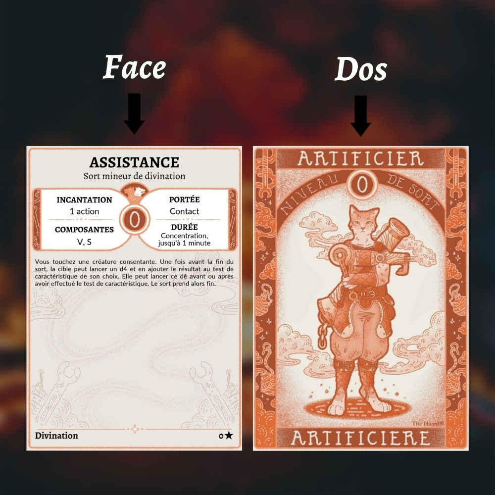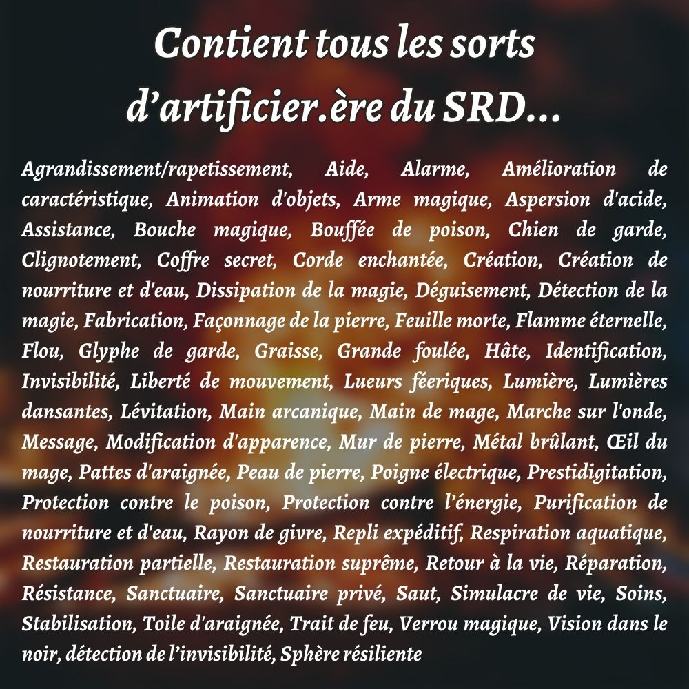 Ce jeu de cartes contient tous les sorts de Artificier / Artificière : Agrandissement/rapetissement, Aide, Alarme, Amélioration de caractéristique, Animation d'objets, Arme magique, Aspersion d'acide, Assistance, Bouche magique, Bouffée de poison, Chien de garde, Clignotement, Coffre secret, Corde enchantée, Création, Création de nourriture et d'eau, Dissipation de la magie, Déguisement, Détection de la magie, Fabrication, Façonnage de la pierre, Feuille morte, Flamme éternelle, Flou, Glyphe de garde, Graisse, Grande foulée, Hâte, Identification, Invisibilité, Liberté de mouvement, Lueurs féeriques, Lumière, Lumières dansantes, Lévitation, Main arcanique, Main de mage, Marche sur l'onde, Message, Modification d'apparence, Mur de pierre, Métal brûlant, Œil du mage, Pattes d'araignée, Peau de pierre, Poigne électrique, Prestidigitation, Protection contre le poison, Protection contre l’énergie, Purification de nourriture et d'eau, Rayon de givre, Repli expéditif, Respiration aquatique, Restauration partielle, Restauration suprême, Retour à la vie, Réparation, Résistance, Sanctuaire, Sanctuaire privé, Saut, Simulacre de vie, Soins, Stabilisation, Toile d'araignée, Trait de feu, Verrou magique, Vision dans le noir, détection de l’invisibilité, Sphère résiliente