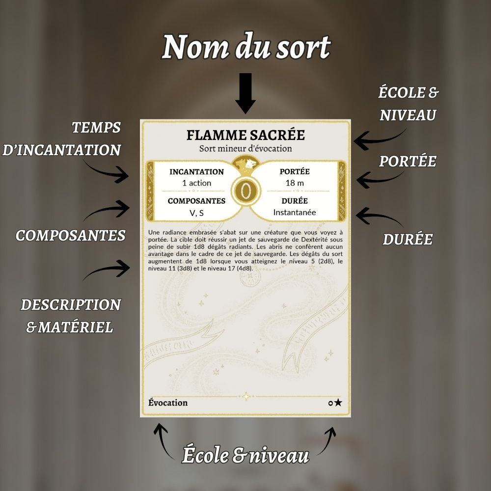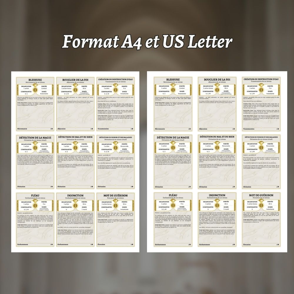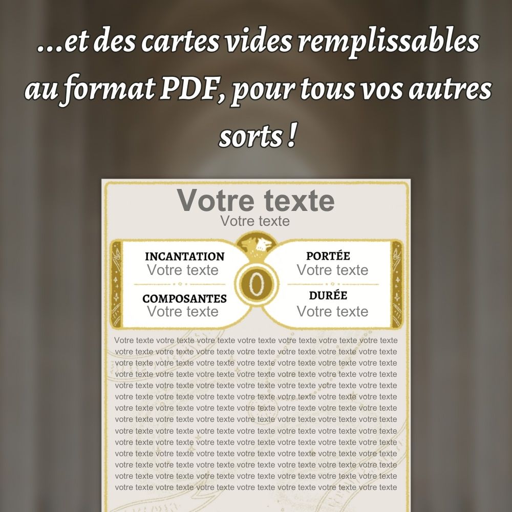✨ En plus des sorts ci-dessous, ce jeu contient des cartes vides remplissables au format PDF pour tous vos autres sorts ! ✨