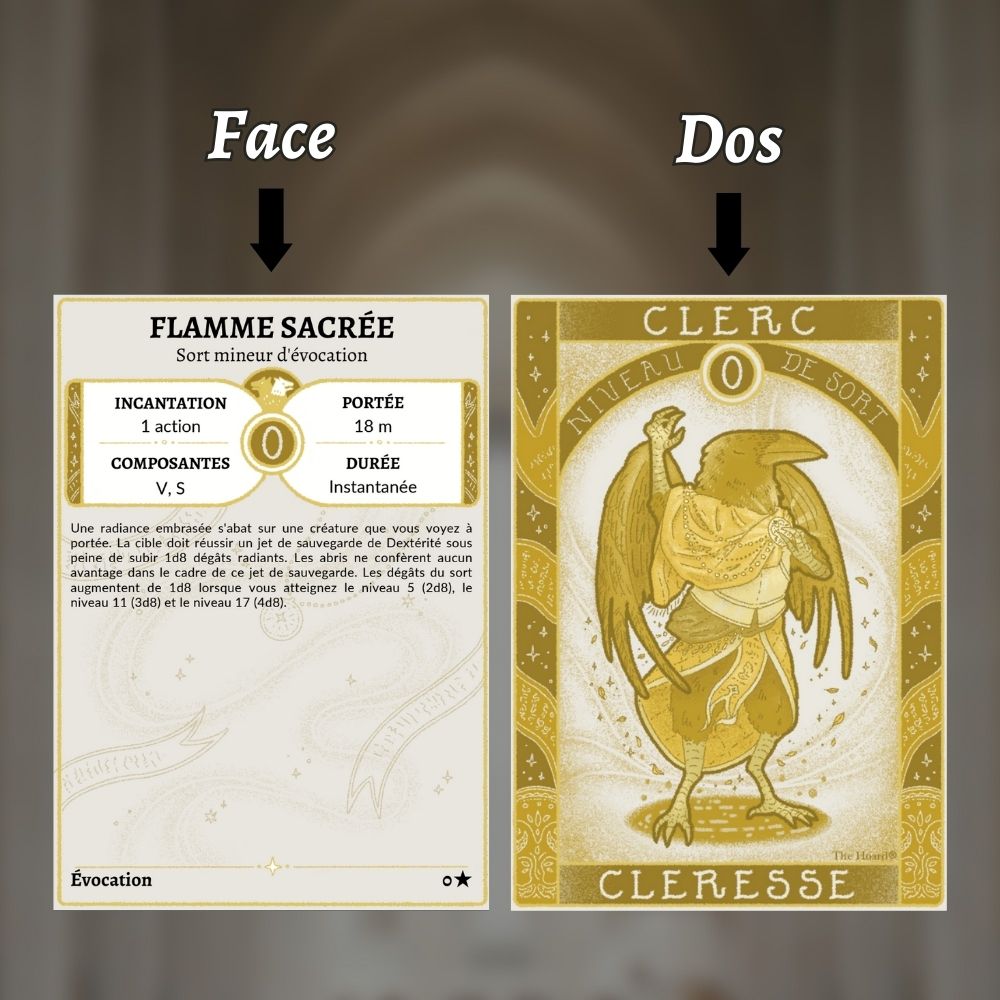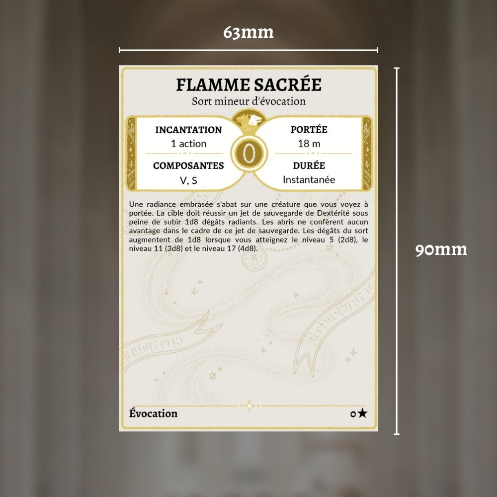 Gardez toutes vos connaissances arcaniques à portée de main avec ces cartes de sorts pour Clercs compatibles avec la 5E. Le contenu de ces cartes vient de la traduction officielle du SRD de Donjons & Dragons par Wizards of the Coast en français, disponible gratuitement ici.