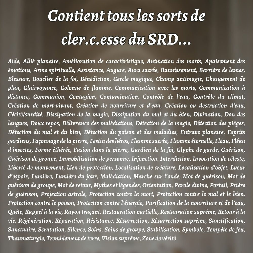 Ce jeu de cartes contient tous les sorts de Clerc : Aide, Allié planaire, Amélioration de caractéristique, Animation des morts, Apaisement des émotions, Arme spirituelle, Assistance, Augure, Aura sacrée, Bannissement, Barrière de lames, Blessure, Bouclier de la foi, Bénédiction, Cercle magique, Champ antimagie, Changement de plan, Clairvoyance, Colonne de flamme, Communication avec les morts, Communication à distance, Communion, Contagion, Contamination, Contrôle de l’eau, Contrôle du climat, Création de mort-vivant, Création de nourriture et d’eau, Création ou destruction d’eau, Cécité/surdité, Dissipation de la magie, Dissipation du mal et du bien, Divination, Don des langues, Doux repos, Délivrance des malédictions, Détection de la magie, Détection des pièges, Détection du mal et du bien, Détection du poison et des maladies, Entrave planaire, Esprits gardiens, Façonnage de la pierre, Festin des héros, Flamme sacrée, Flamme éternelle, Fléau, Fléau d’insectes, Forme éthérée, Fusion dans la pierre, Gardien de la foi, Glyphe de garde, Guérison, Guérison de groupe, Immobilisation de personne, Injonction, Interdiction, Invocation de céleste, Liberté de mouvement, Lien de protection, Localisation de créature, Localisation d’objet, Lueur d’espoir, Lumière, Lumière du jour, Malédiction, Marche sur l’onde, Mot de guérison, Mot de guérison de groupe, Mot de retour, Mythes et légendes, Orientation, Parole divine, Portail, Prière de guérison, Projection astrale, Protection contre la mort, Protection contre le mal et le bien, Protection contre le poison, Protection contre l’énergie, Purification de la nourriture et de l’eau, Quête, Rappel à la vie, Rayon traçant, Restauration partielle, Restauration suprême, Retour à la vie, Régénération, Réparation, Résistance, Résurrection, Résurrection suprême, Sanctification, Sanctuaire, Scrutation, Silence, Soins, Soins de groupe, Stabilisation, Symbole, Tempête de feu, Thaumaturgie, Tremblement de terre, Vision suprême, Zone de vérité