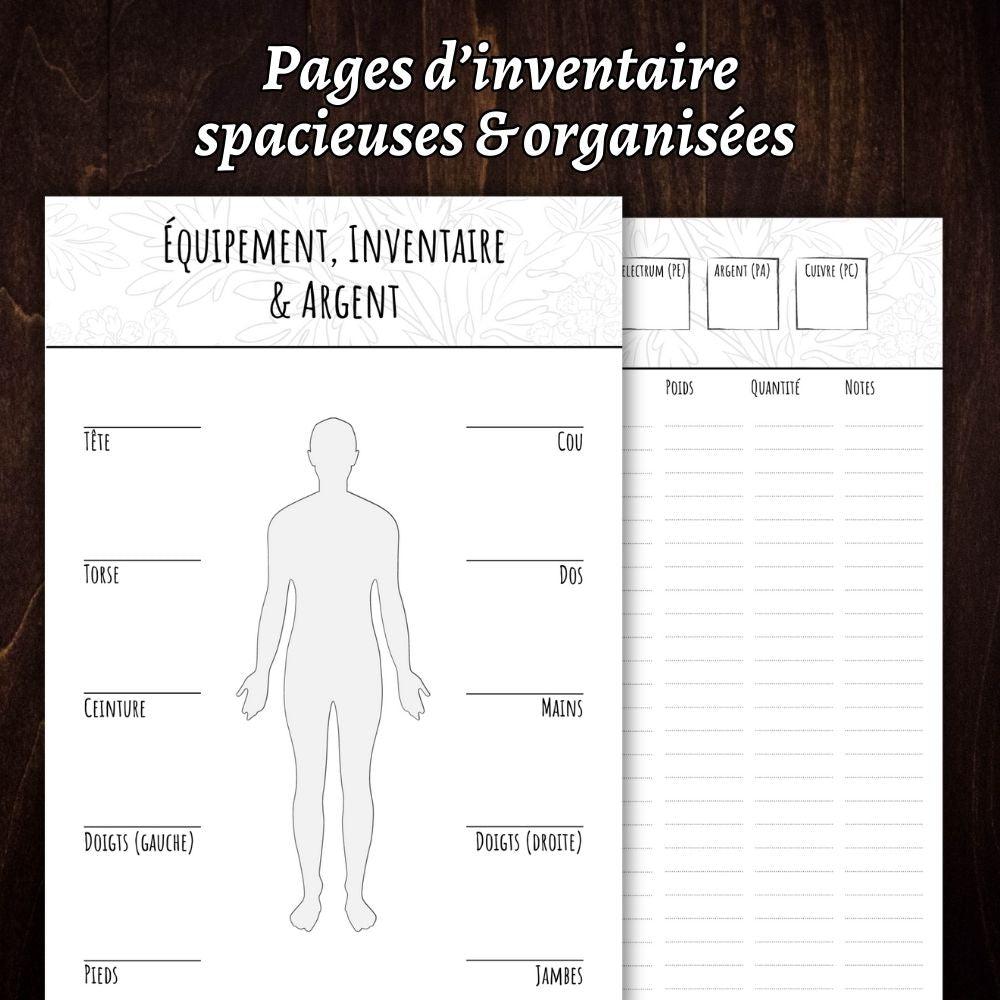 • 2 pages spacieuses et organisées dédiées à votre Équipement, Inventaire et Argent