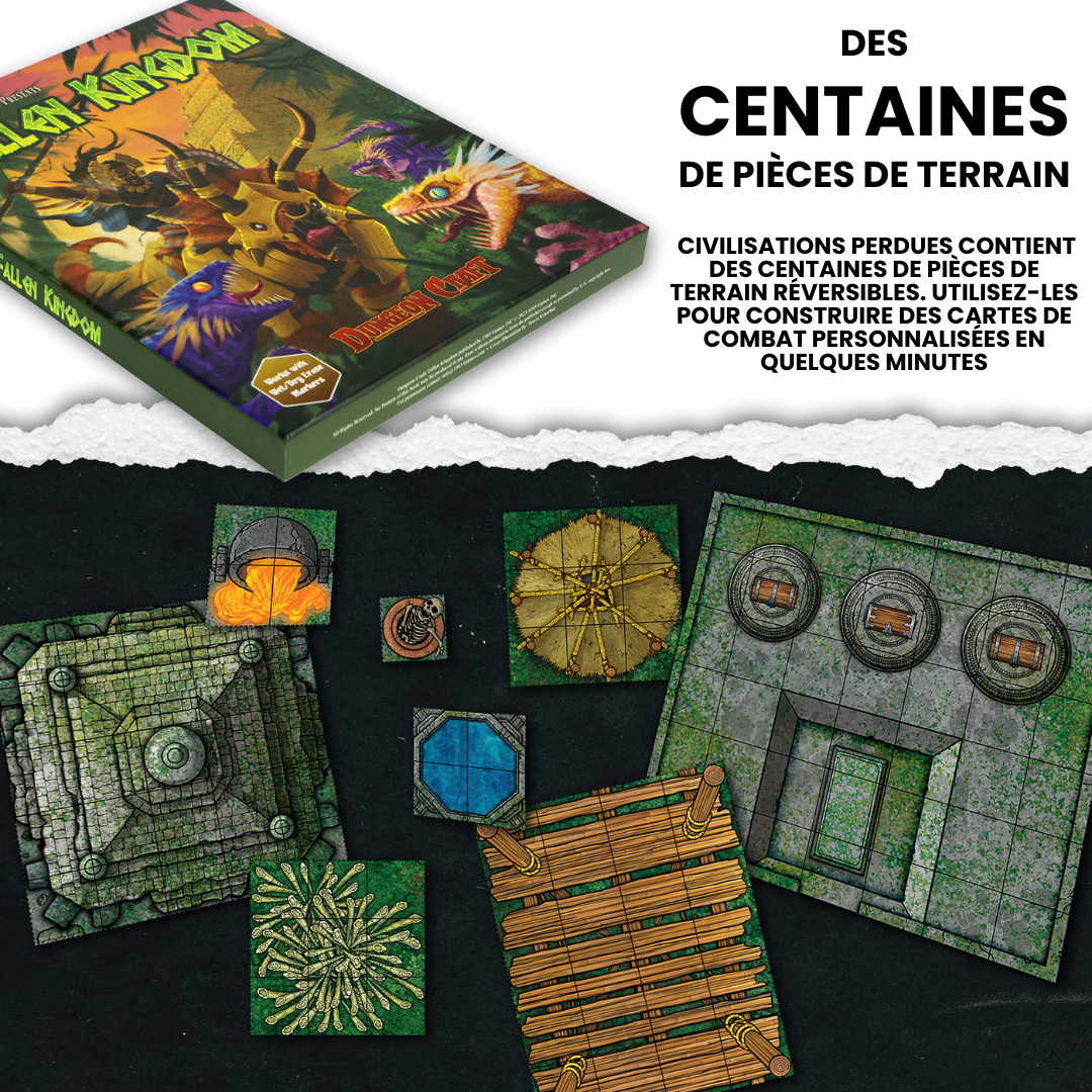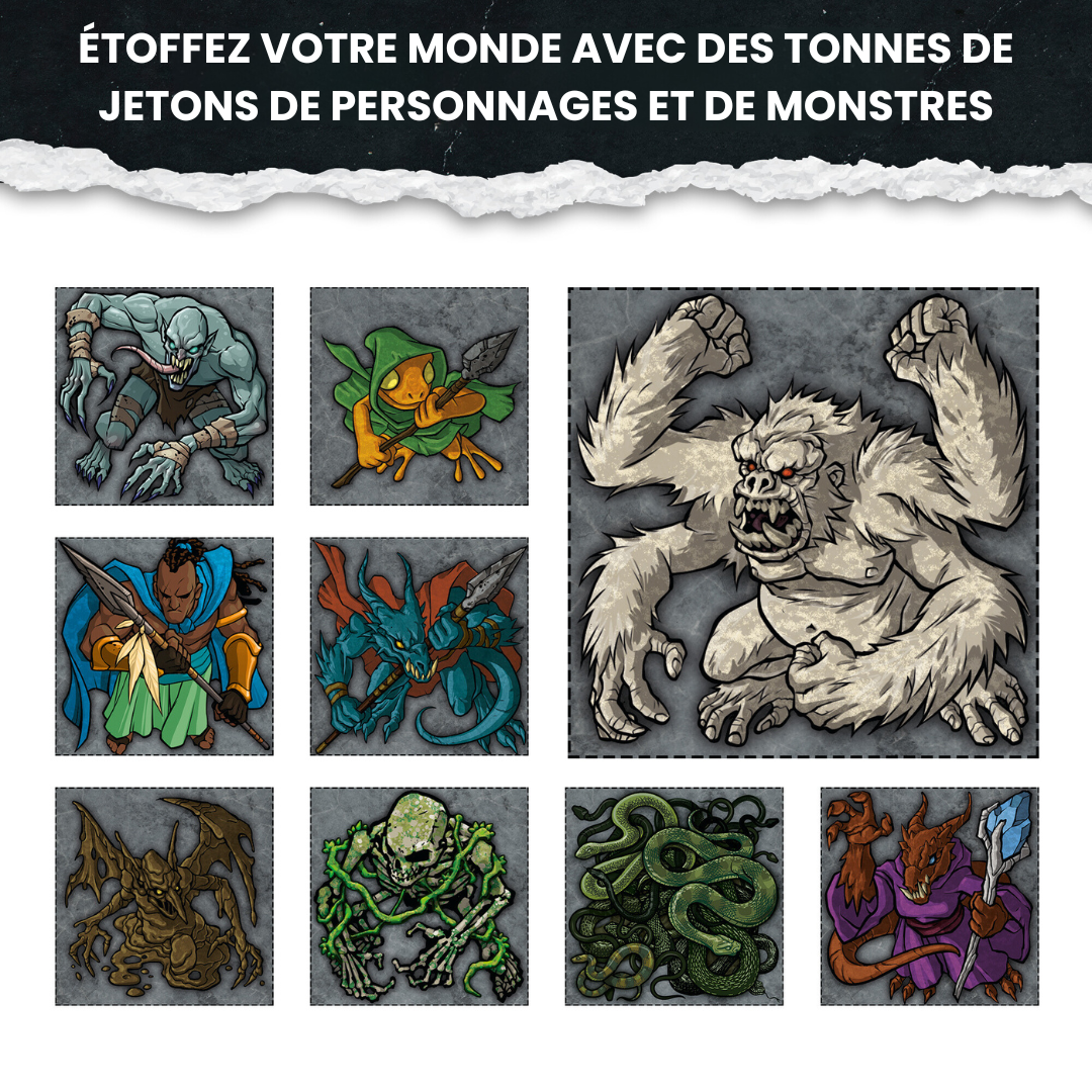 Explorez des terres luxuriantes et des ruines anciennes avec plus de 880 pièces de décors, monstres et humanoïdes soigneusement conçus. Ce volume comprend des temples en ruines, des ponts de bois, des monstres tropicaux et bien plus encore, parfaits pour créer des rencontres immersives dans des environnements exotiques et mythiques.